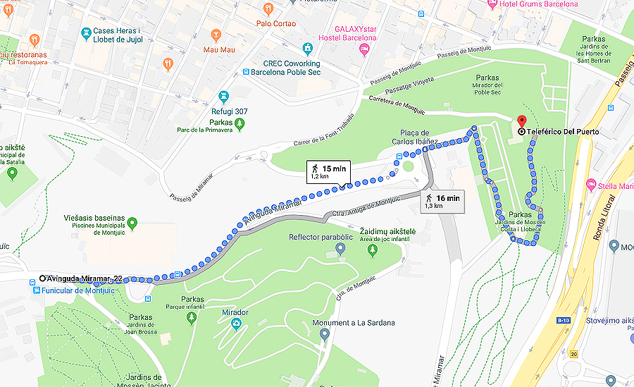 Keltuvo, kuris kelia į Monžuko kalną internetinis psl. www.telefericdemontjuic.cat Eiti į Paralel sustojimą, ten sėst į traukinuką, kuris atveža į keltuvų pradžią. Mūsų atveju tai buvo autobusas, nes traukinukas nedirbo.