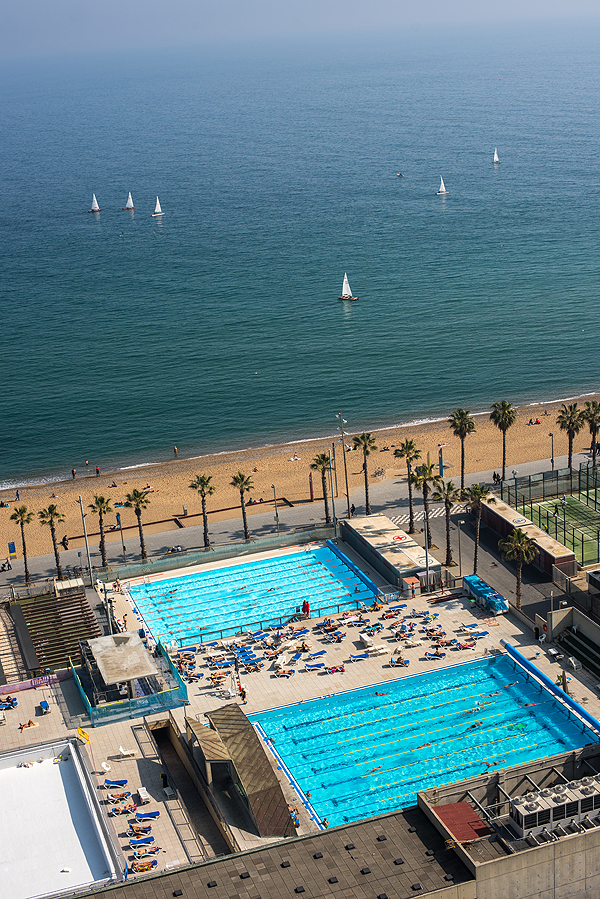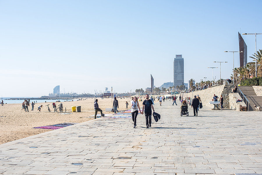 Einame link mašinos, telefonas rodo, kad bus apie 4km. Netikėtai užklystam į tai, ko ieškojom puse dienos - krūva bariukų su stalais lauke - vėlgi, šalia labiausiai vyrui patikusios vietos Barselonoje - pliažo. Prisėdam ko nors atsigerti. Idilė - saulutė leidžiasi, Barselonos pliažo vaizdai, palmės linguoja... Nors vėjas nemažas jau, vėsoka, mažė atima mano megztinį.
