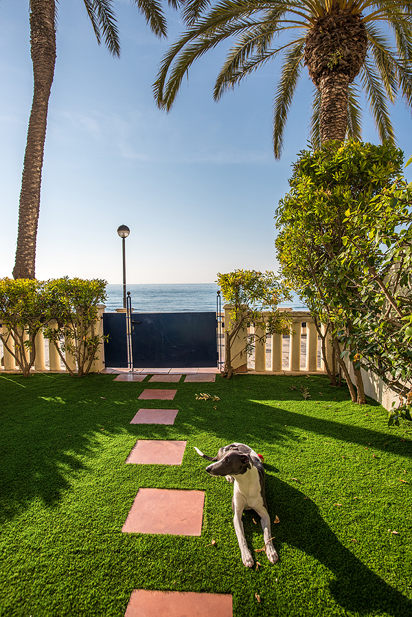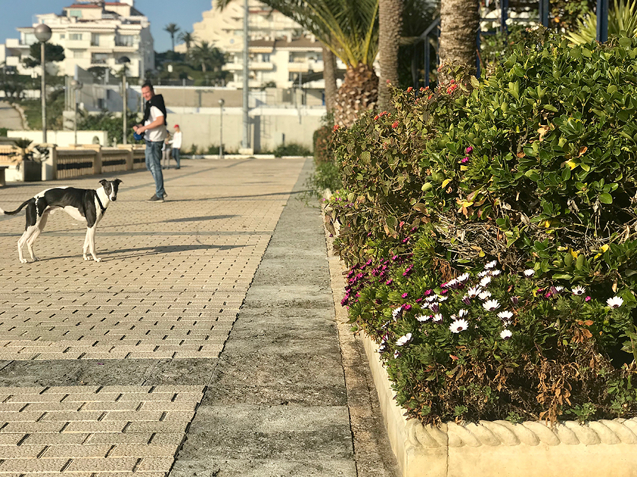 Ilgiausiai užtrunka paskutinis 100 km, stovim Barselonos kamščiuose, nerandam Melia Sidges hotel privažiavimo... Galų gale įsikuriam naujuos namuos, jie vėsūs, priplėkusiu drėgnu oru, nors gan jaukūs, ir šalia jūra. Kol ne sezonas ir pliažas pusiau nuosavas - rytais šunį paleidžiam be pavadėlio. Bet nusiviliu dirbtine žole, paveiksliuke airbnb buvo tikra.