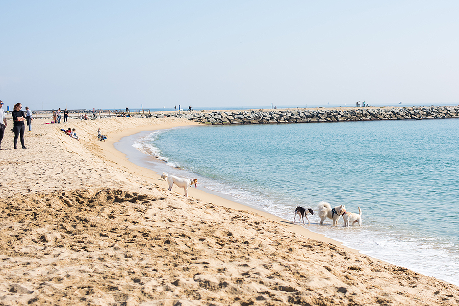 Šunys paleidžiami bėgioti kol neprasidėjo maudymosi sezonas. Oi, prisilakstė mūsų Ogis!