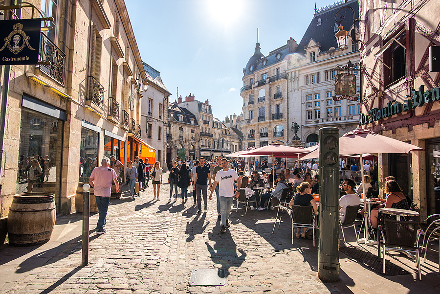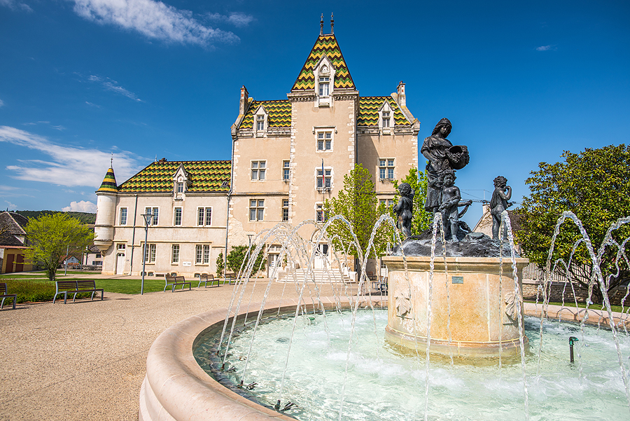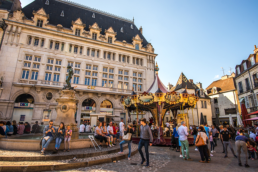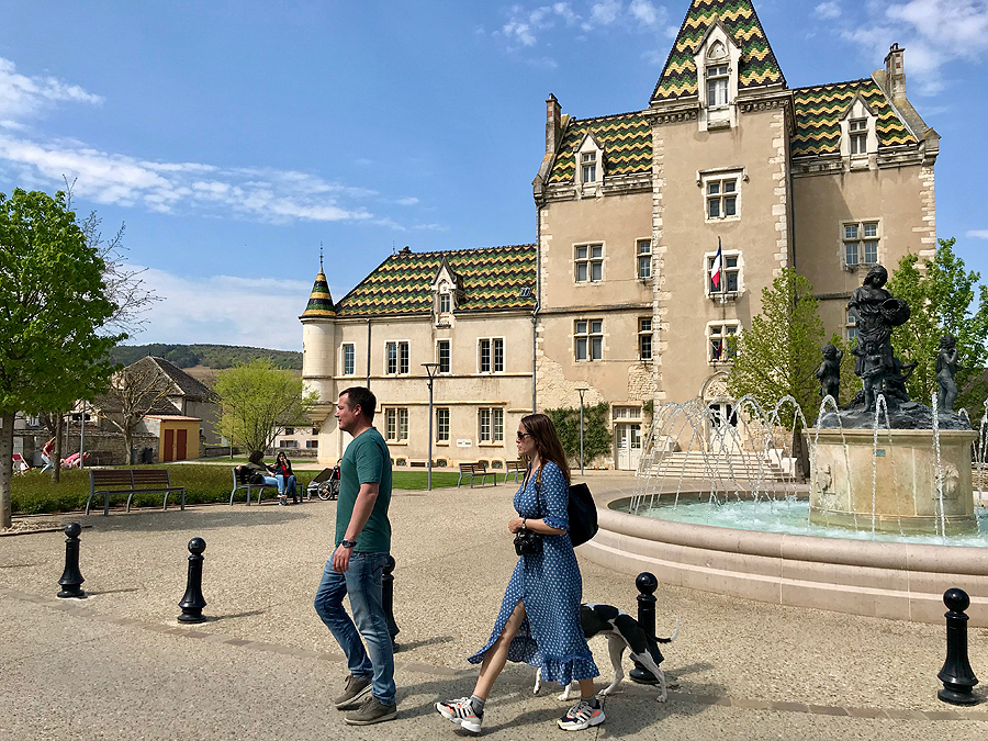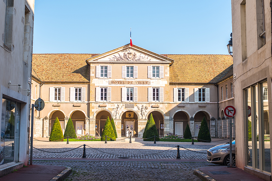 Miestelio centras. Vėl Burgundijai tipiški stogai.
