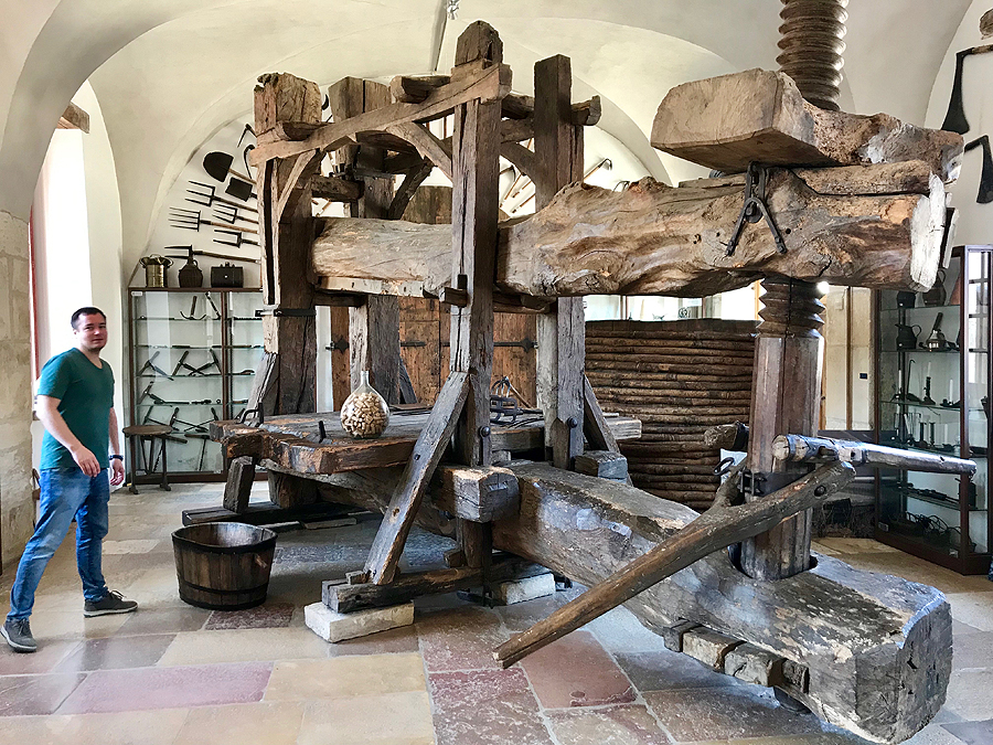 Senoviškas vyno darymo įrenginys. Įspūdingas agregatas. Tolumoje matosi kubilas, kur vynuoges kojomis spaudžia.