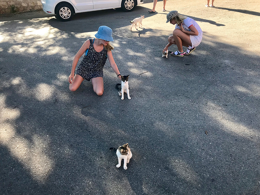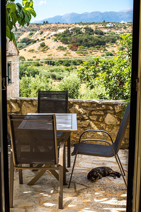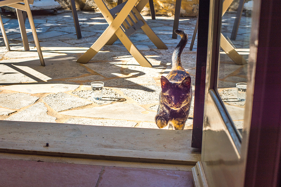 Grįžusi terasoj randu nuosavą atostogų katiną, įpilu jam gerti. Panašu, kad gyviais čia rūpinamasi, Chanijoj matėm kačių ėdalo ant žemės paberta.