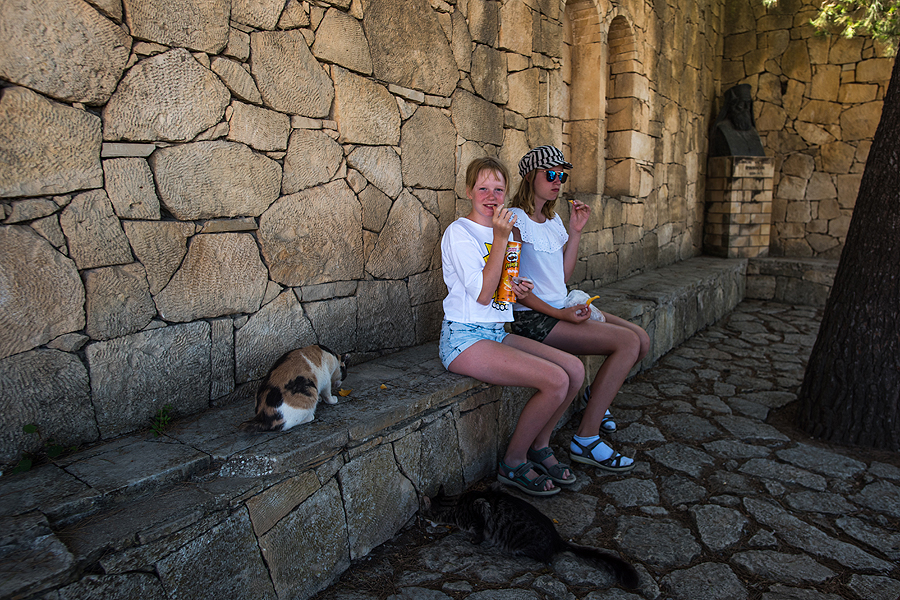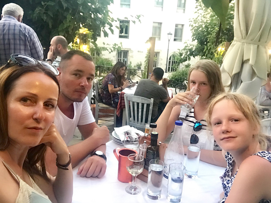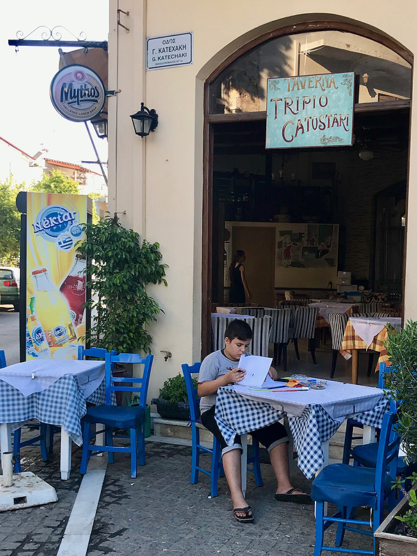 Perkam retsina vyno - geriamas, bet nieko ypatingo. Vietinėj parduotuvėj pardavėja klausia, ar turiu nuolaidų kortelę ar turisto. Sakau: "Turisto". Ir tai akivaizdu, aš su baisiniu fotiko krepšiu, vaikai šlapiais plaukais ir vyras visas bordavai raudonas - įdega greitai ir labai tamsiai.