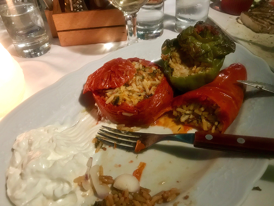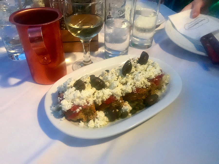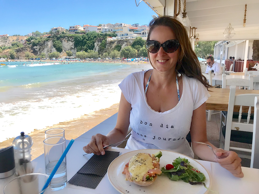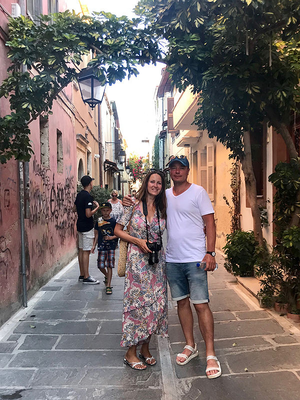 Ir mus įtraukia į taverną uoste, sakydami, kad ją rekomenduoja lietuviška turizmo knygutė, ir tuoj pat rėkia kolegai - Lietuva! Tada tas iš krūvos kitų ištraukia LT travel gidą, atverčia Retimno psl. ir rodo rekomendaciją valgyti pas juos... Ten ir sėdam, super skanu ir jauku, bet nepigu. Bet mes su vyru šįvakar švenčiam cielus 16 metų kartu...