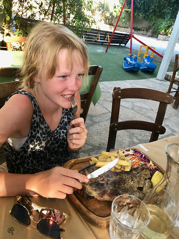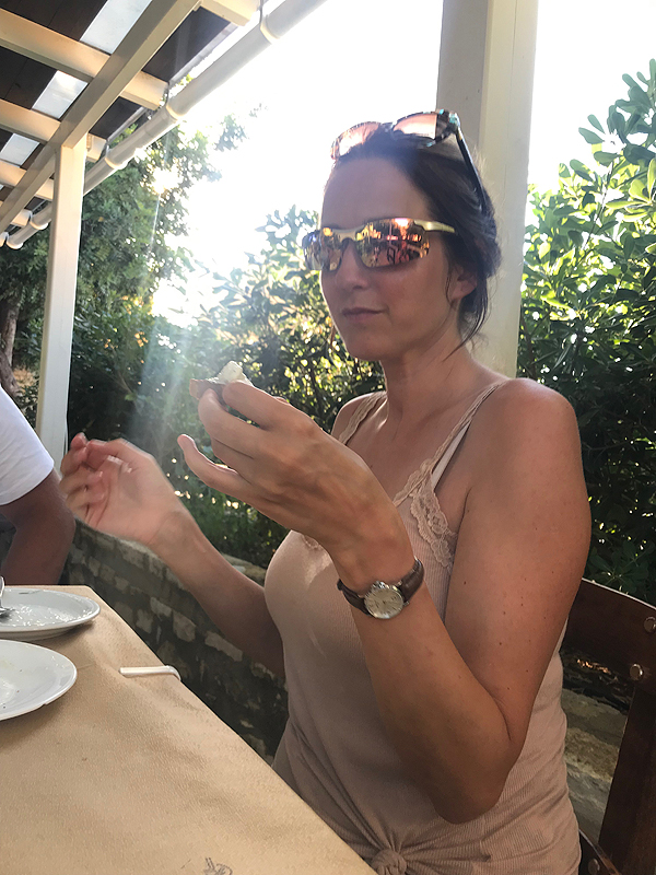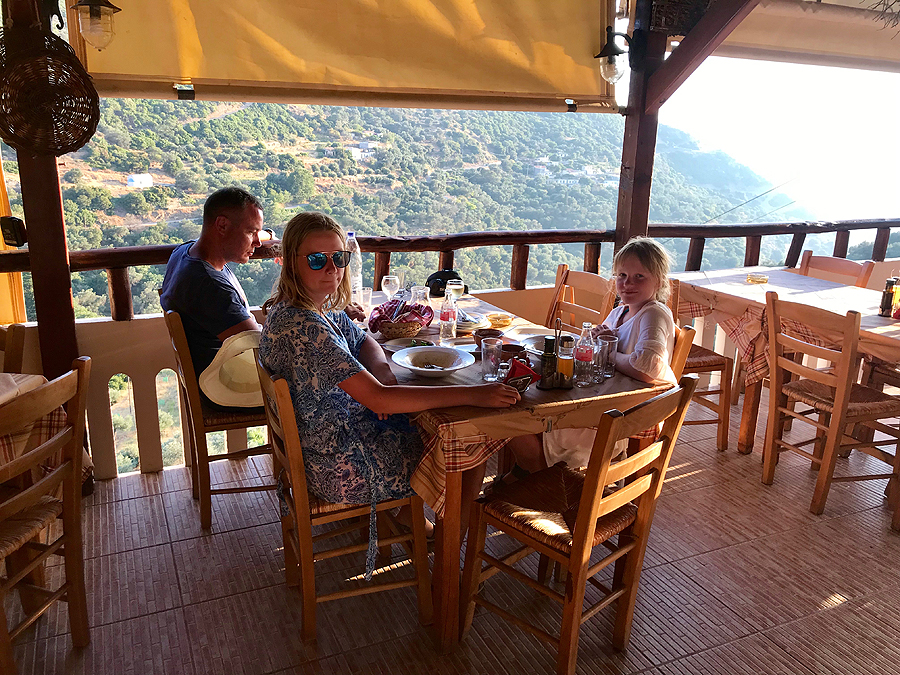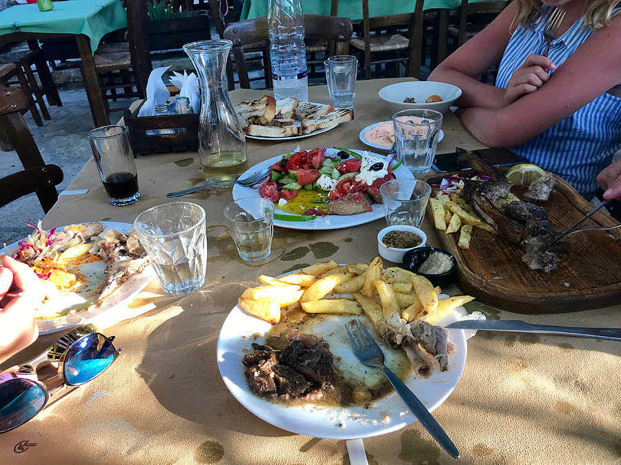 Bandom naują taverną savo kaime, skanu, tzatziki, duona, sūrio kamuoliukai ir sūrio padažas dičkei, mes dalinamės avieną, vištą ir kiaulieną plius milžiniška porcija graikiškų salotų. Galui gaunam šokoladinio tortuko ir rakės. Kaip visad išeinam sprogstančiais pilvais.