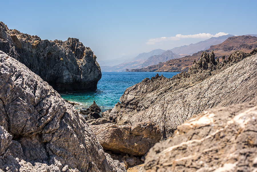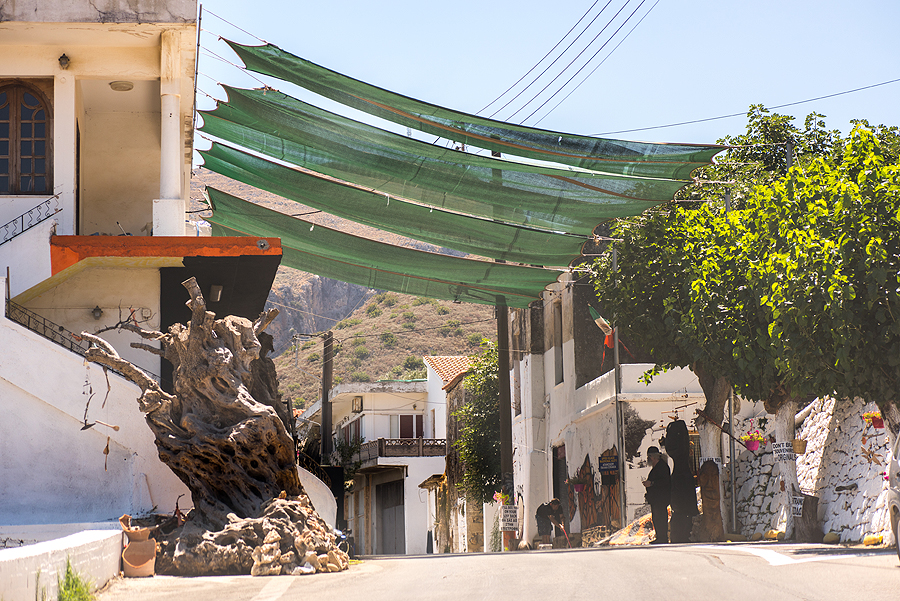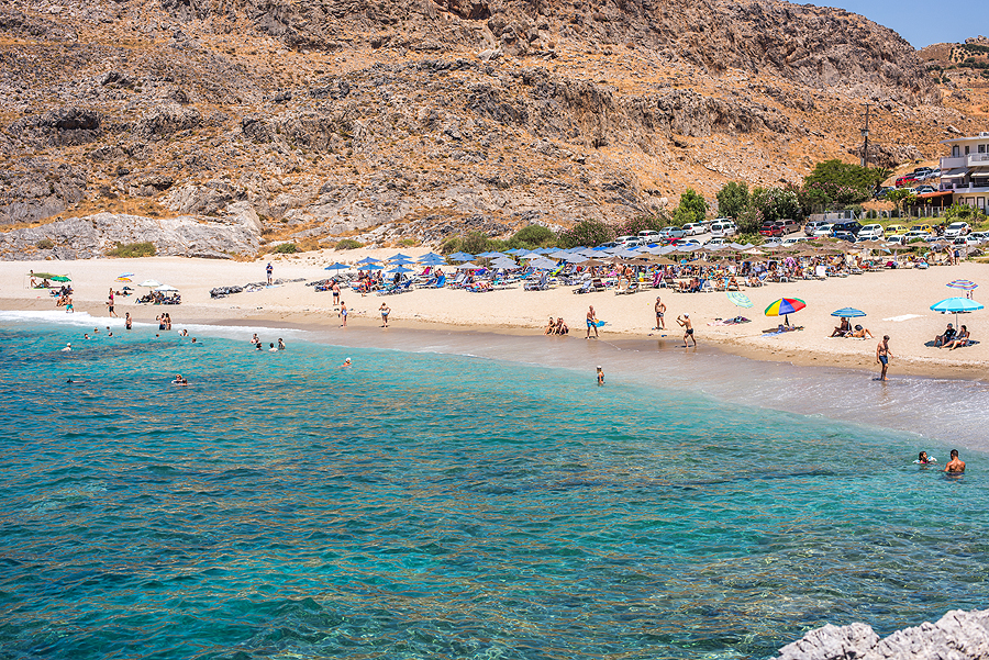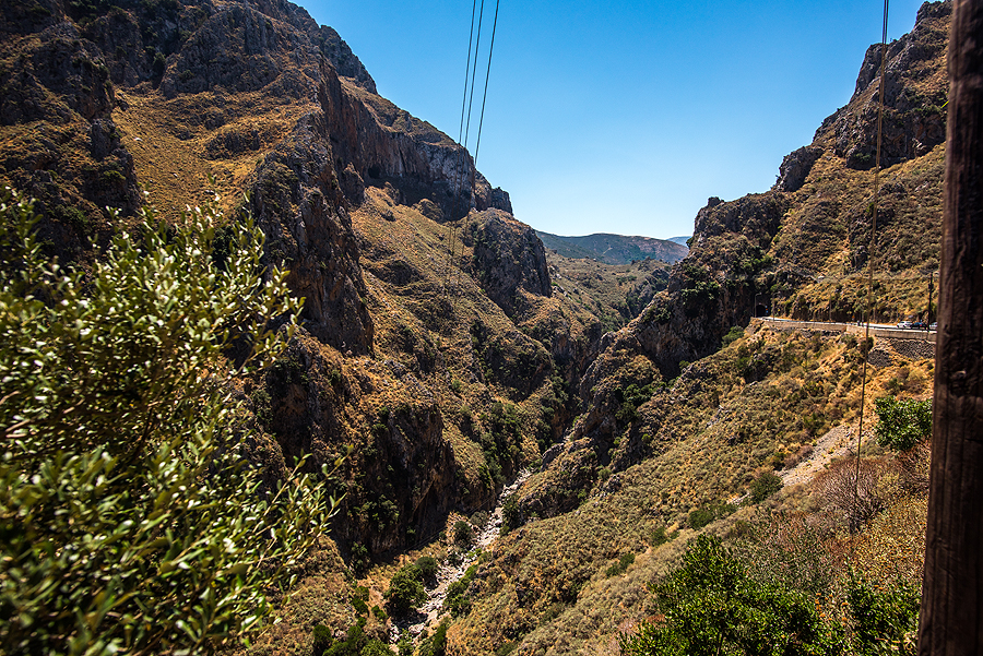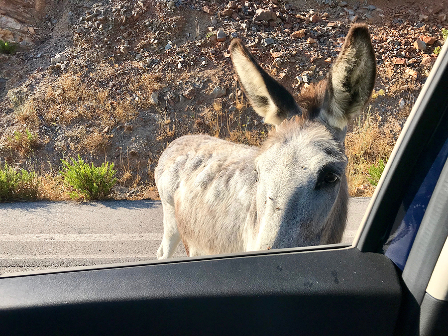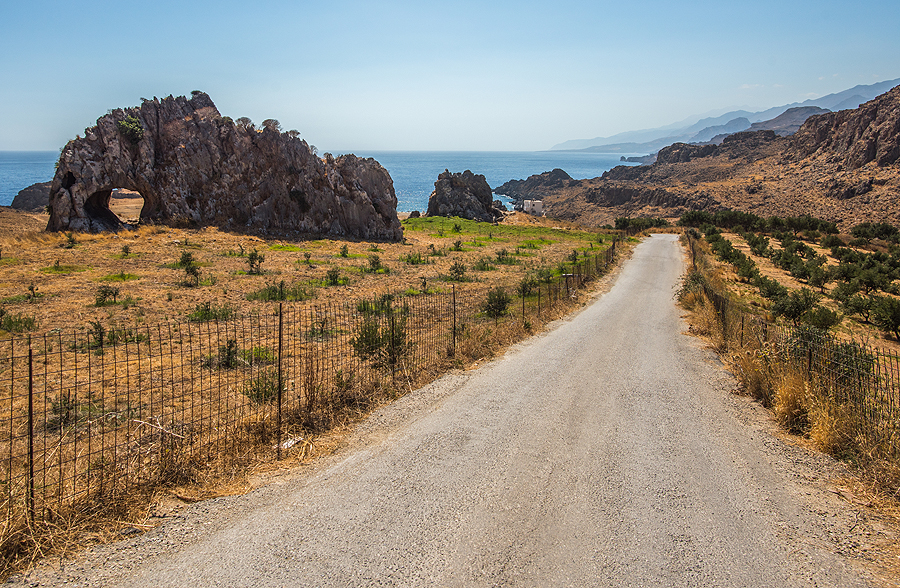 Po pusryčių (arbūzo ir ledų), varom į kitą salos pusę, nusižiūrėjom paplūdimiuką. 66 km važiuoti virš valandos. Atrodo, paplūdimių nors vežimu vežk ir šalia, bet gi toliau įdomiau. Pravažiuojam pro akmenimis apibyrėjusį Kourtaliotiko tarpeklį, dar randam uolą su apvalia skyle visai šalia Skinaria psplūdimio.
