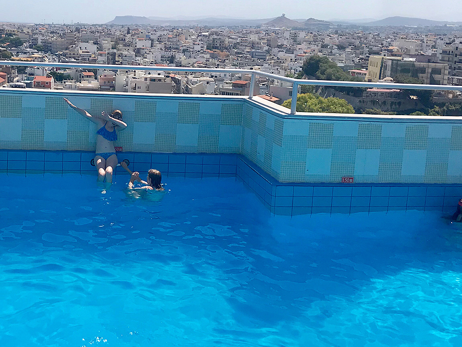 Mūsų namai 7 dienom tampa nedidukas trijų aukštų namukas mažam kaime Douliana netoli Chanios, du miegamieji, du vonios kambariai, svetainė, du balkonai, terasa su nuosavu besidraskančiu katinu ir baseinas, kurį pirmą vakarą uzurpavusi italų šeima, tėvai geria proseco ir drybso ant gultų, o trys paaugliai vaikai be perstojo darosi video selfius.