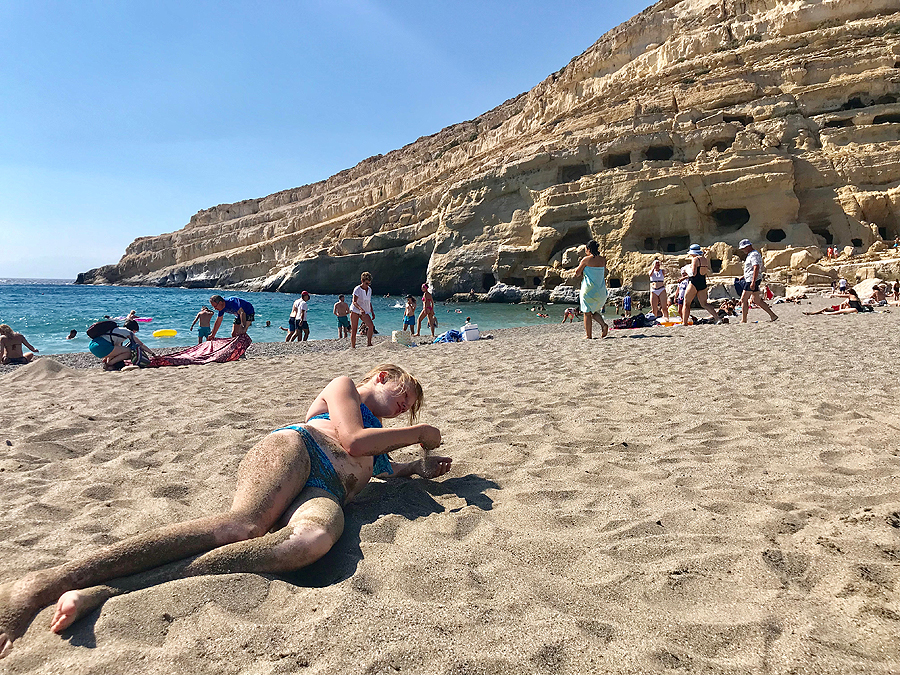 Stiprus vėjas ir fantastiško grožio uola, su ertmėmis uolose, pro jas landžioja žmonės, mes nesusigundom, pernelyg karšta... Skėčio savo neįmanoma pasistatyt dėl vėjo, tenka imt skėtį plius du gultus, viskas 6eu. Guliu ir vėjas bloškia žvyrą į akis - smėliukas Matala gal ir ne žvyras, bet jausmelis lygiai toks.
