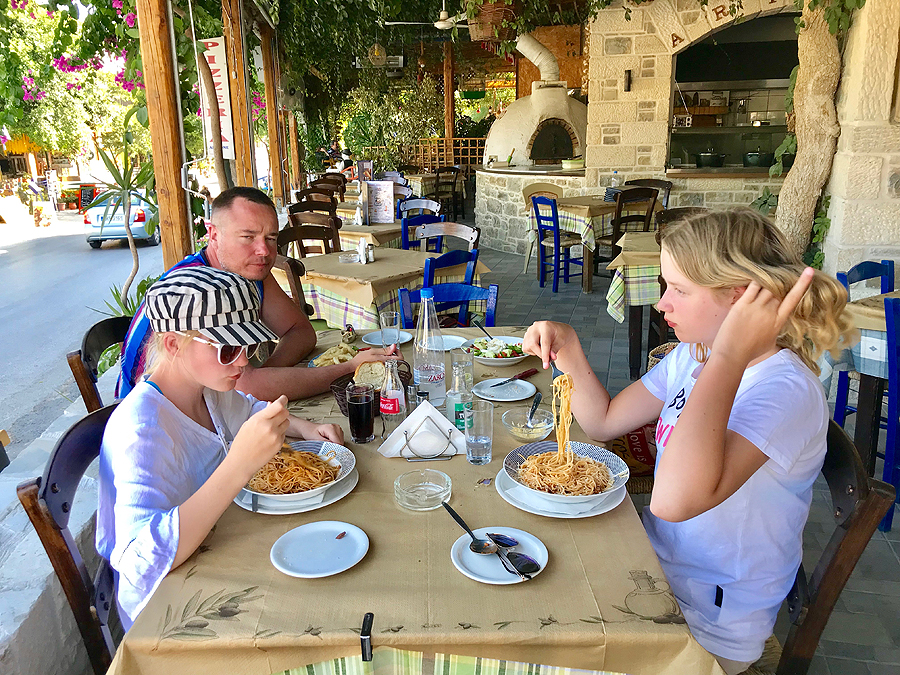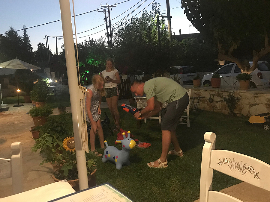 Mūsiškės nors nori, nelenda į baseiną, tad einam vakarieniauti. Taverna - trys žingsniai nuo namų, su dideliu kiemu ir gražiu vaizdu į slėnį. Vaikai daro cooking show, laukdami maisto. Tėvas prisideda laimikio dorojime.