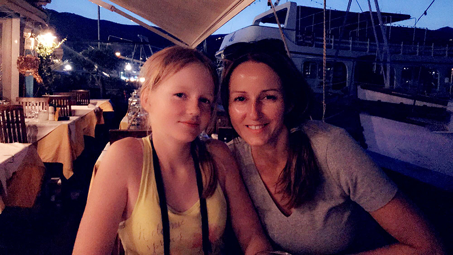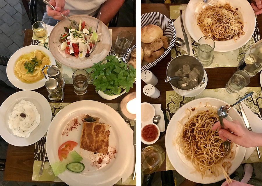 Tzadziki kelios porcijos, aštuonkojis, vaikam pica ir makarai, mes užsigeriam vietiniu rausvu vynu. Gale gaunam prizą - pyrago, persunkto citrina, nerealiai skanus, man tenka supust tris gabalus, saugant šeimos garbę. Šeima tuo tarpu įnikusi į atneštų vaisių naikinimą. Dejuoju, kad dar ryt reiks į maudomą įlyst ir padoriai atrodyt. Bet skanu...