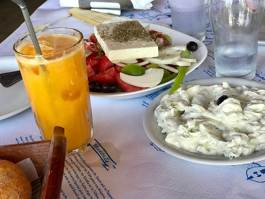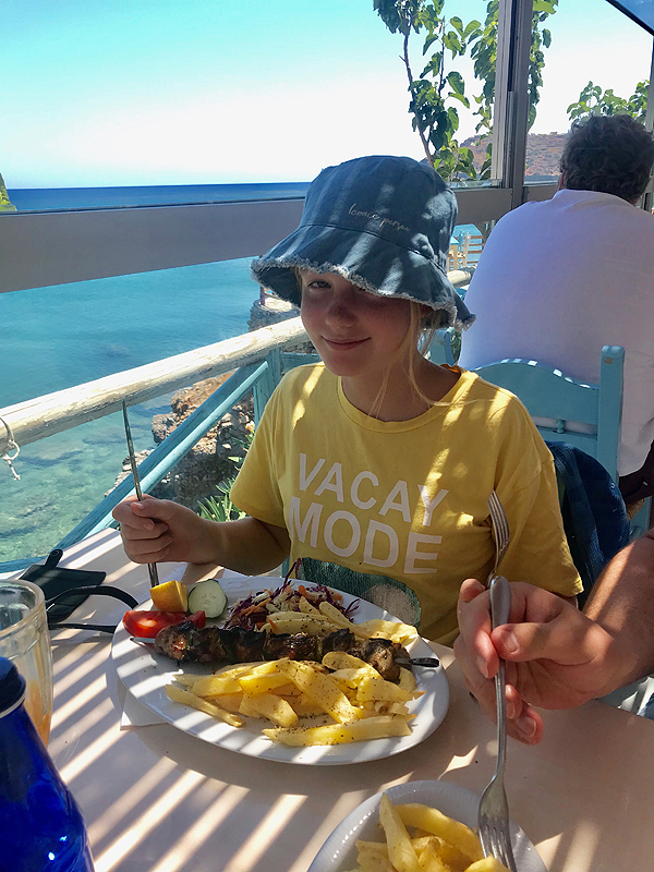Sulaukiam išsinuomotos mašinos, važiuojam link Eloundos miestelio 200km pro medžių dydžio oleandrus, alyvuogių plantacijas, miestelius, beveik visą kelią kairėje šmėkščioja turkio spalvos jūra, žmonės maudoooosiiii... Pavalgom mažam miestuky Paralia Fodele, šalia jūros, bet tik salotos, tzadziki ir aviena patiko, souvlaki kietas... ne pats geriausias pasirinkimas. Viską dalijamės, porcijos nemažos, paliekam 27eu.