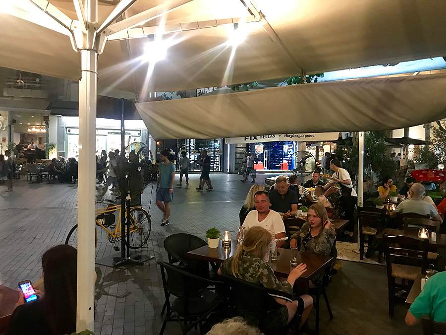 Tik 60 km ir virš valandos ir mes jau Heraklione. Prie viešbučio mašiną tvarkingai šveicarlietuviškai pasistatyt be šansų, užstatyta net draudžiamos vietos, tad apsukam kelis garbės ratus, prisiparkuojam mokamoj aikštelėj, kažkokiam prižiūrėtojui vyras švysteli raktus - tipo jis pastatys mašiną ir drožiam link viešbučio registruotis. Aš pasiimu fotiką, savo tašę, nu maža ką. Įsiregistruojam be problemų, susikuičiam ir lendam vakarienės į naktinį Heraklioną.
