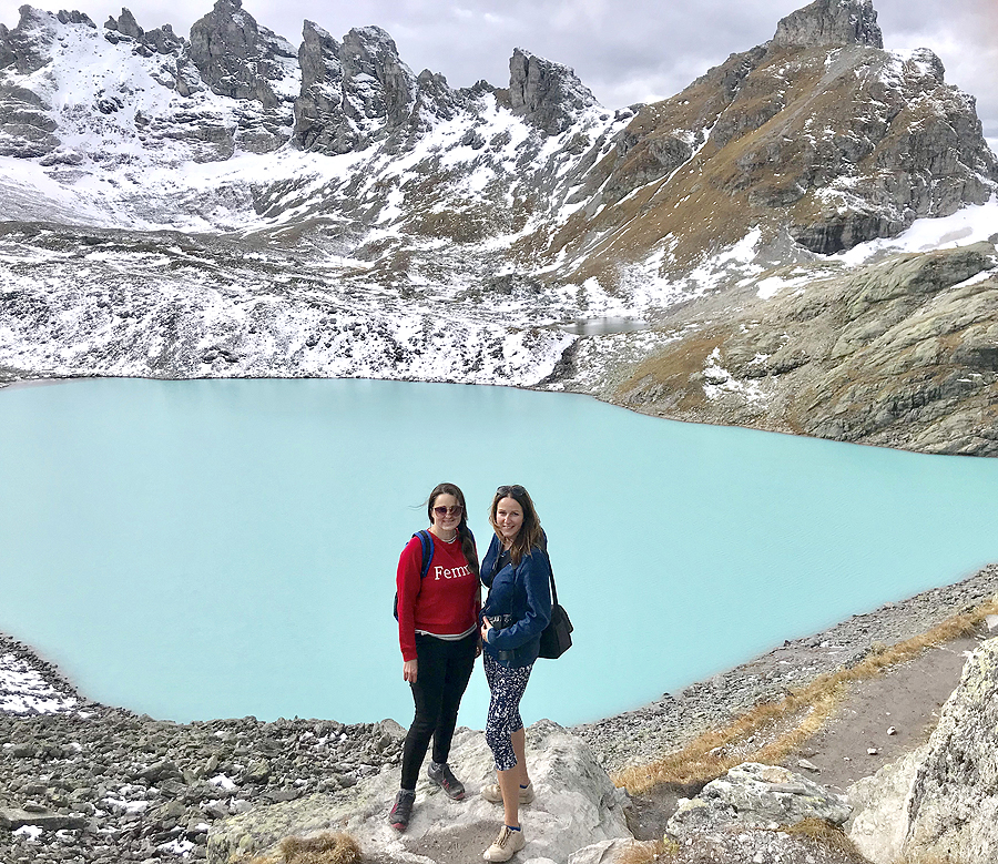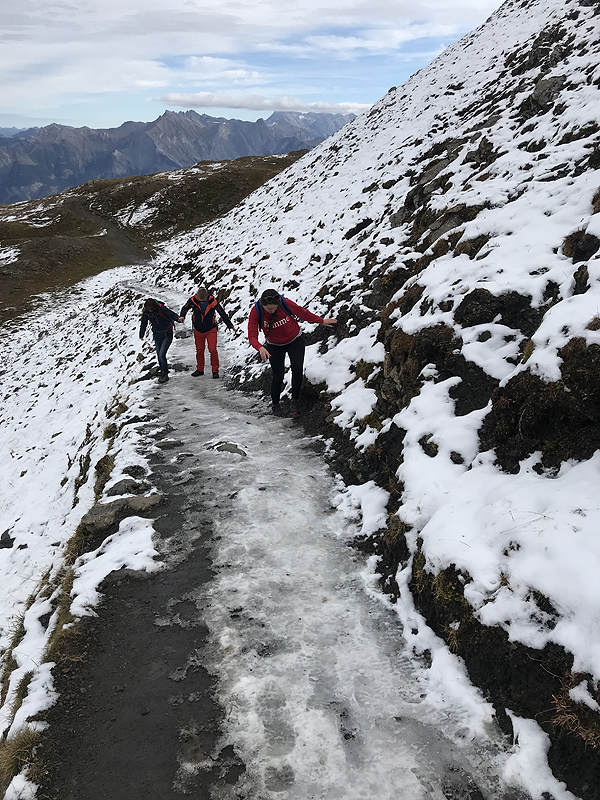 Sutinkame lenkę, be galo susižavėjusią Šveicarija, ji nori čia gyventi, eina visą 5 ežerų kelią, ir apranga jos gerokai rimtesnė negu mūsų - bilietų kasoje mums minėjo, kad aukščiau dar yra sniego - o gal JAU yra, juk dabar spalis? Taigi, lenkė pametė pirštines, o mes jas matėme apačioje! Tariamės, jei rasime, kad paimsim ir paliksim jas kasoje, nes lenkė jau nebegrįš ten, kur jas pametė, eina tolyn ratu, o mes ten apsisukę tuoj būsime. Žinoma, pirštinių neberandame, gaila, grįžusios žemyn bilietų kasoj perduodam jai žinutę.