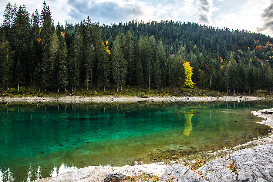 Caumasee ežeriukas žavi perregimu vandeniu ir rudenėjančio miško fonu.