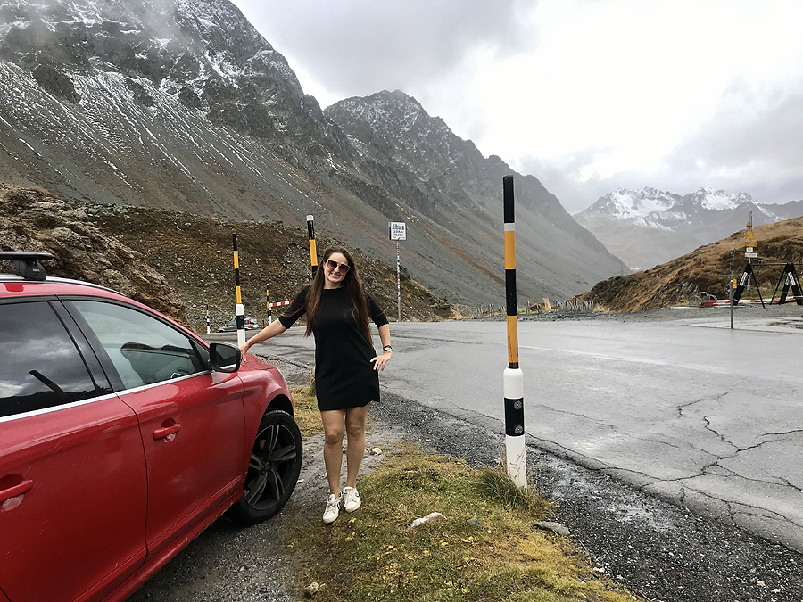 Pravažiuojame vis aukščiau ir aukščiau, kol pasiekiame Albula kalnų kelio viršūnę - stojam įsiamžinti. Štai mano vairuoja šaunuolė. Už nugaros matosi kalnų perėjos viršūnę žymintis ženklas - Albula pass 2315m virš jūros lygio.