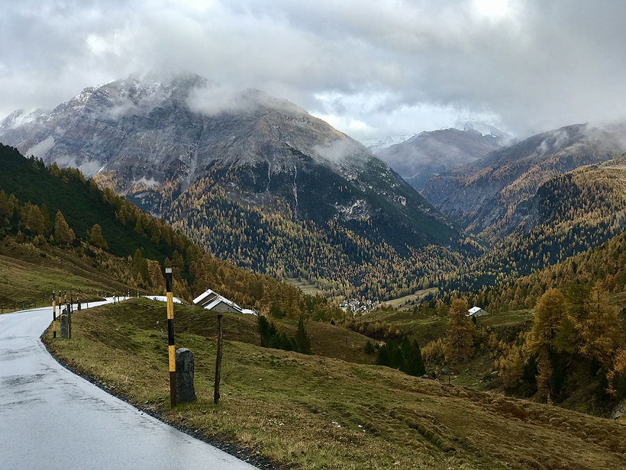Minam toliau iki savo taško - Engadin miestelio su Spa baseinais, vis dar tikim, kad važiuosim ne kalnų keliu ir greitai būsime vietoje :) vargstam, važiuojam aukštyn ir aukštyn, keliai ne kartą remontuojami, matyti kelio įgriovos ir vėliau tas gelsvų žalių spygliuočių fonas, apačioje kalnų upė - nu "nors tiek pamatėm" - sakom.