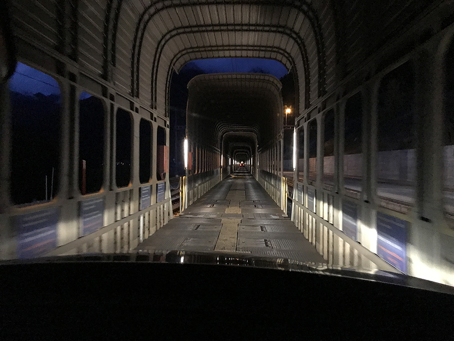 Per plauką spėjame įvažiuoti į tunelį ir užsiropšti ant bėgių su mašina. Turim 15 min relakso, kol mus kelia kalnų viduriuose iš vieno Šveicarijos galo į kitą - mūsų civilizaciją. Kai pasižiūri žemėlapyje - mūsų baseino miestuką ir namus skyrė vargani 139km, bet kelias eina per kalnus, o tai nelygu 139km lygiu gražiu keliu.