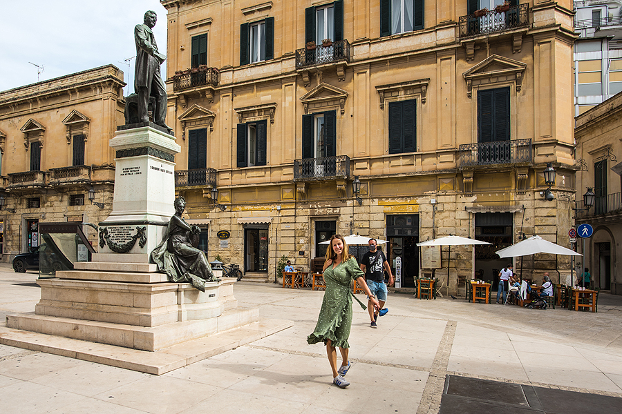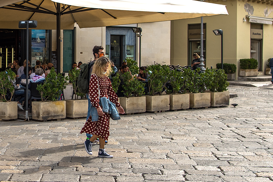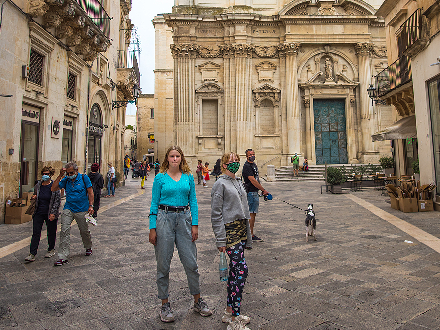 Parkuojamės prie Benetono, šalia gražios aikštės, pereinam gatves - dauguma su kaukėm vaikšto. Prieinam Sant'Oronzo aikštę, vyras su vaikais eina nupirkti daugkartinių kaukių, o mane paleidžia pasiganyti.