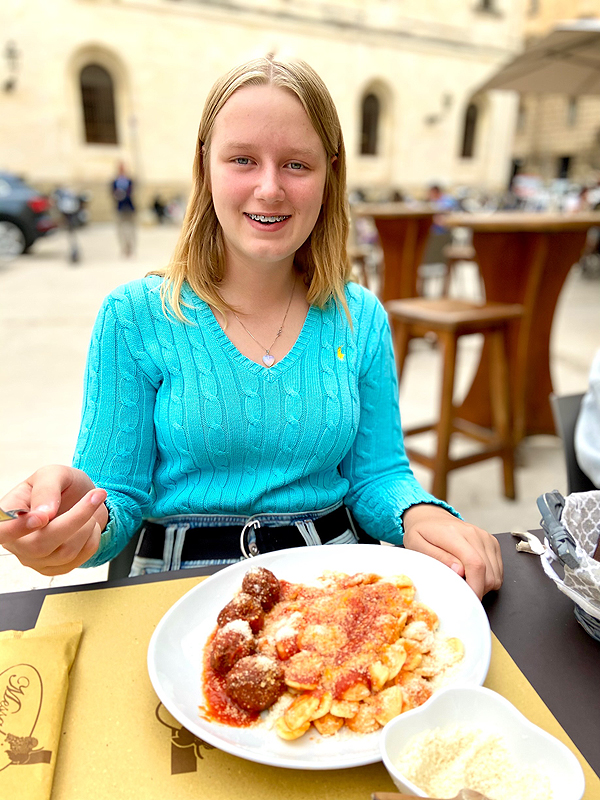 Sėdam bariuke, nes vaikai pradeda zyst, saulutė šildo, smagu. Miglė valgo apulietiškus makaroniukus - kriauklelės formos, vadinamus orecchiette su pomidorų padažu.