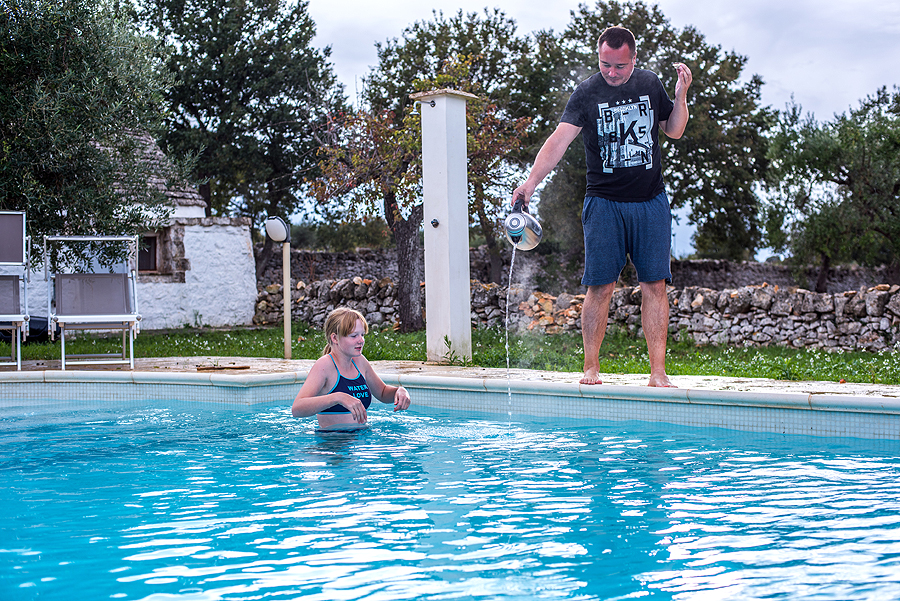 Šitam vaikui nebūdinga būt sausais plaukais baseine. Išlindo švelni saulutė, prašau atsisukti ir mauna lauk iš baseino - per šalta.