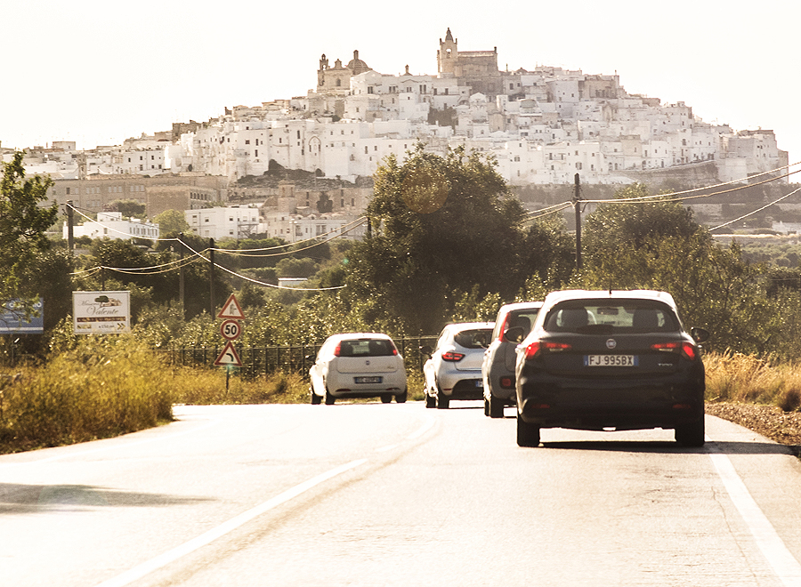 Išvarom prie jūros, bandau surast paplūdimį, kuris tiktų ir man su gražiais vaizdais, ir vyrui, kuris nori pasnorkelint. Torre Guaceto atrodo tinkamas variantas, o dar pakeliui pravažiuojam pro Ostuni. Kažkaip į miestelio vidų nesinorėjo, vėl gi - korona, ir dar prisiskaičiau, kad Ostuni - Anglijos kolonija beveik. Pilna barų su Fish and chips, daug UK gyventojų... Nenoriu. Be to baltų namukų miestelių prisižiūrėjome Andalūzijoje. Štai tiek mums užtenka Ostunio - foto važiuojant namo.