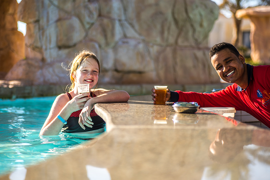 Paslaugusis baro darbuotojas ir mano mažylė. Alus - man.