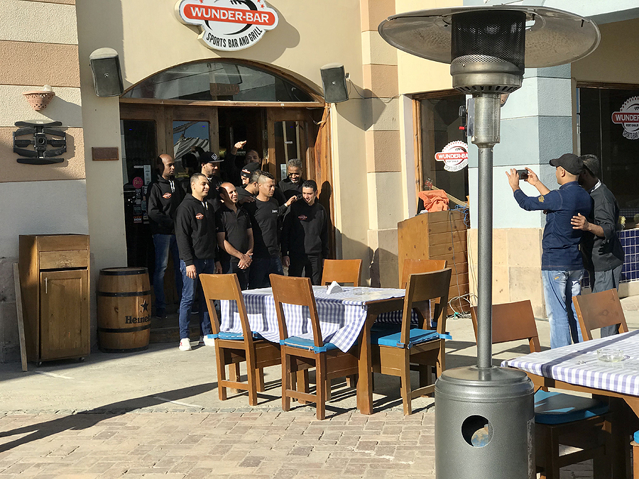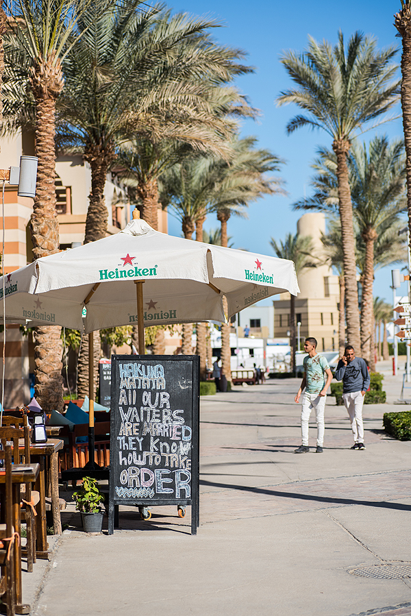 Na, o toliau mūsų išvykimai - pradžioje važiuojam į Port Ghalib ramų, turistinį kurortinį miestelioką prasiblaškymui ir parduotuvėms. Dieną prieš buvome Luxore, kuriam skirsiu atskirą įrašą, tad norėjosi ko ramesnio... Nuotraukoje šalia baro stovinčioje reklamoje užrašyta – “visi mūsų padavėjai yra vedę ir žino, kaip priimti užsakymus” – angliškai order reiškia ir įsakymas, tad musulmonės gal ir ne tokios užguitos, kaip mums atrodo.