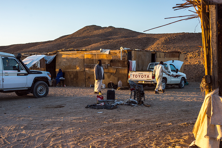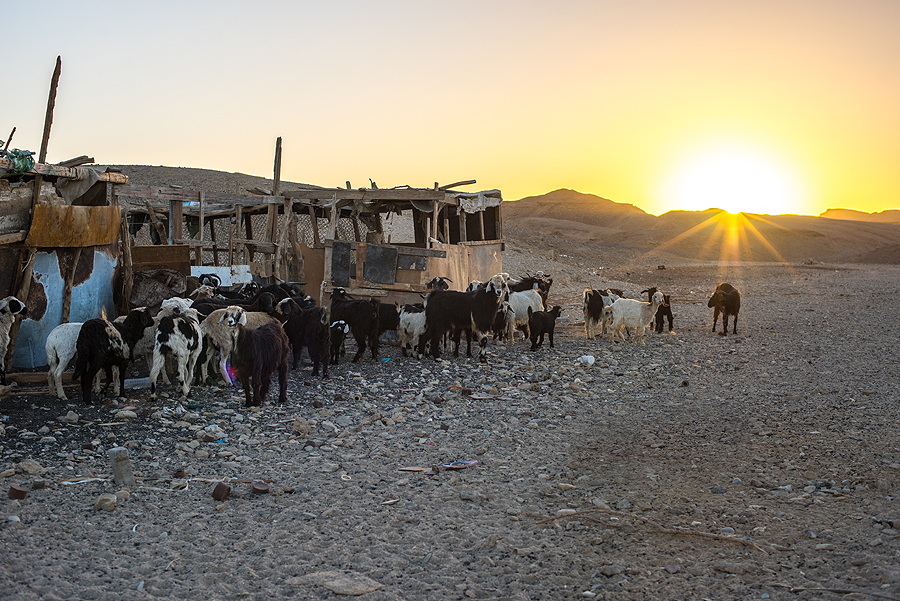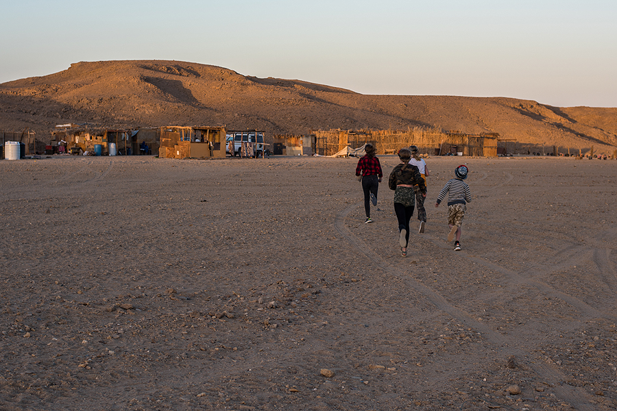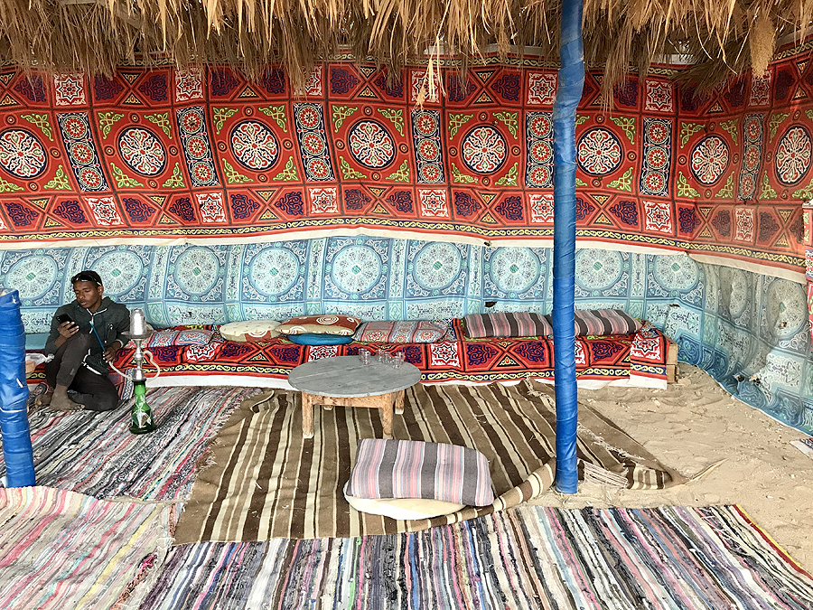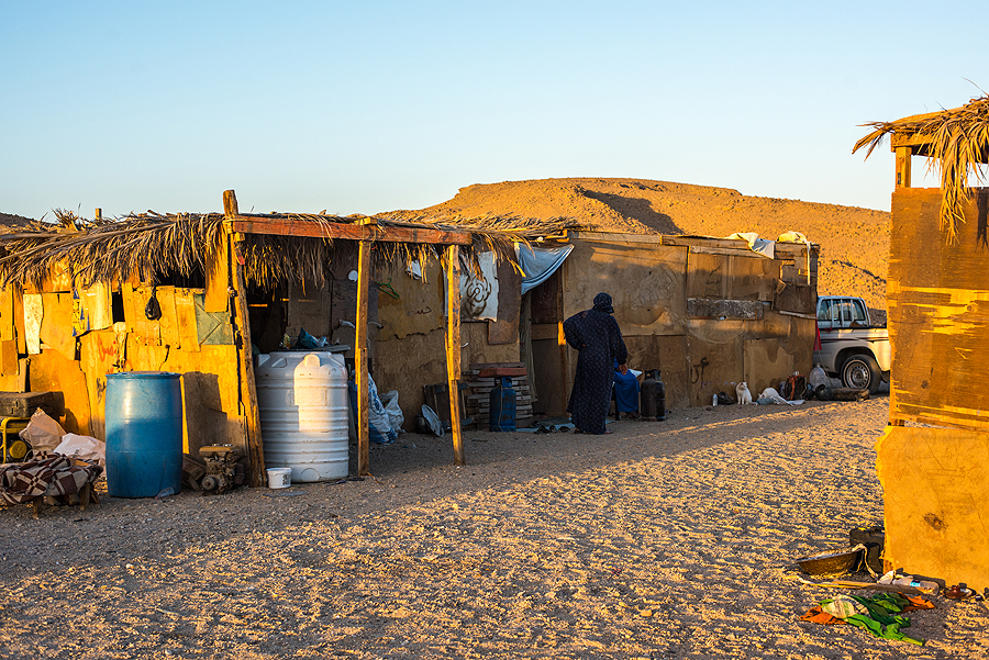 Atvažiuojame pas beduinus ir tokioje palapinėje gauname arbatos. Siūlė ir obuolių kaljaną, bet mes atsisakėme. Užtat mūsų gidai neatsisakė. Pasakojo, kad beduinų vaikai eina į mokyklą El Quesiro miestuke, kad jiems yra būtina mašina, nes kiekvieną dieną važinėja. Moteris namuose prižiūri ūkį, ožkas, kepa duoną, vyrai uždarbiauja turizmo sektoriuje...