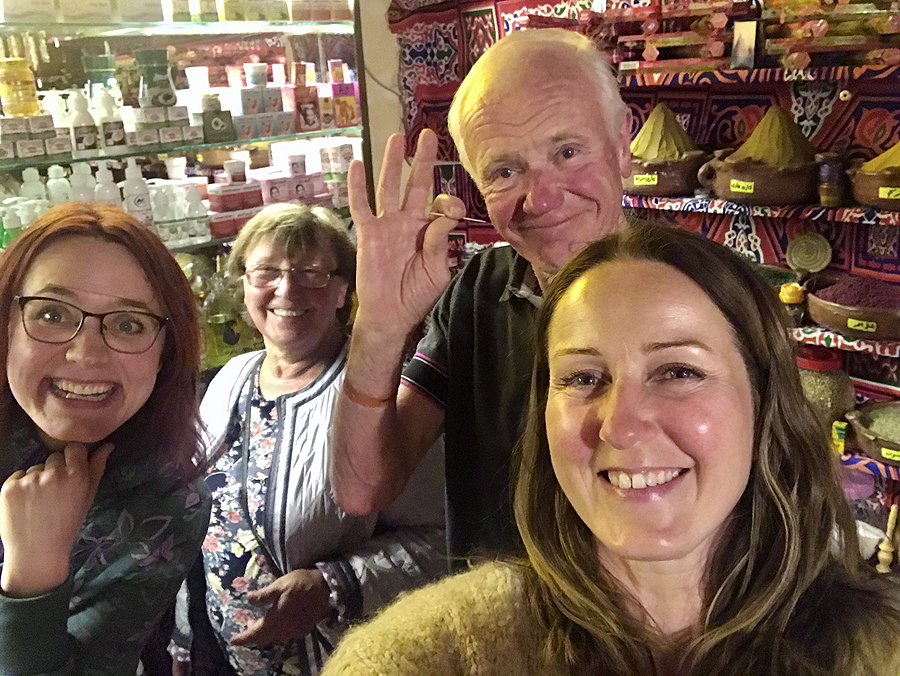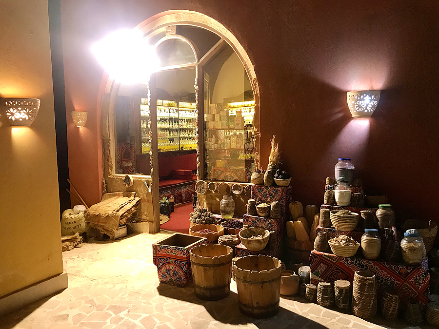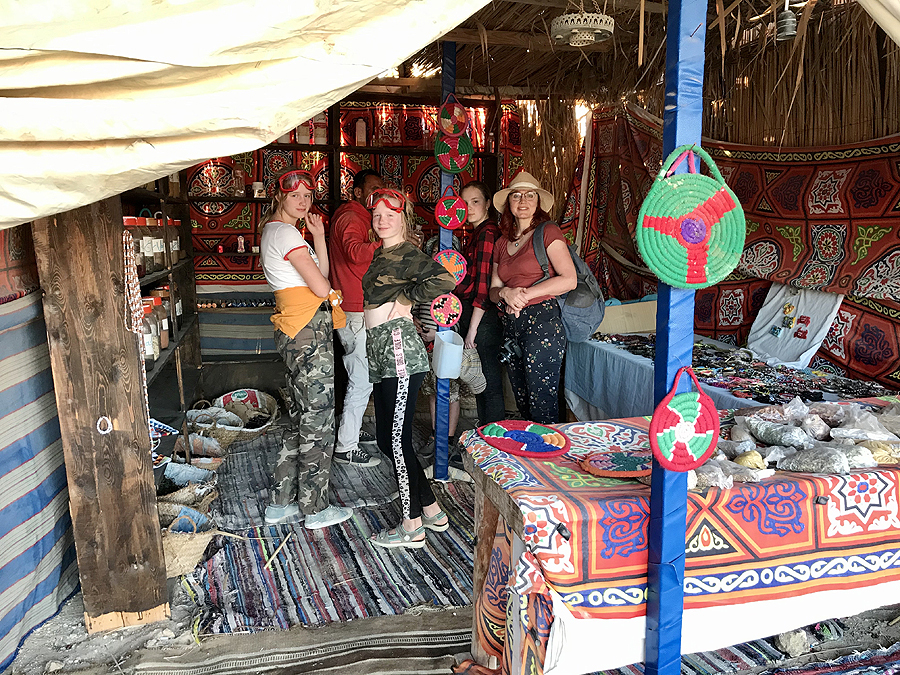 Parduotuvėlėje pilna gėrybių - prieskoniai, arbatos, aliejai, megztos kepurytės, papuošalai, kuriuos neva suverė vietinės beduinės. Vaikai išsikaulija suvenyrų atsiminimui.