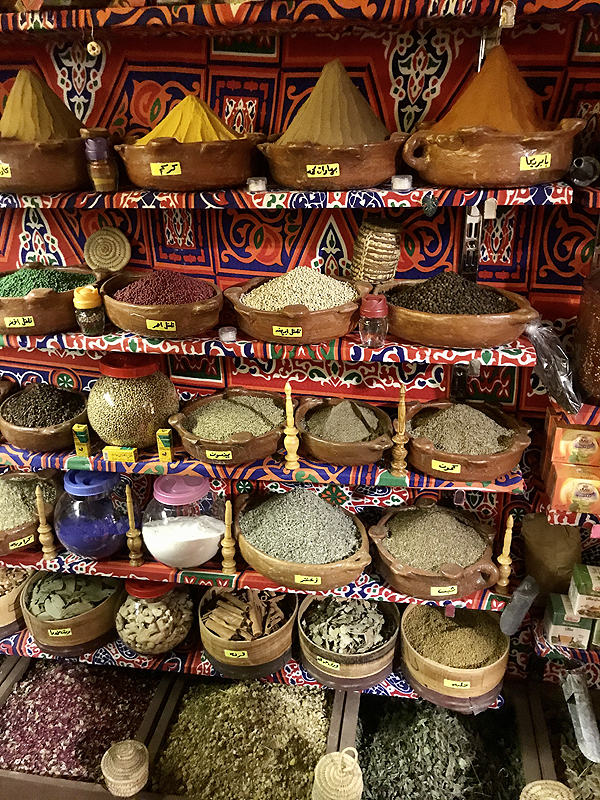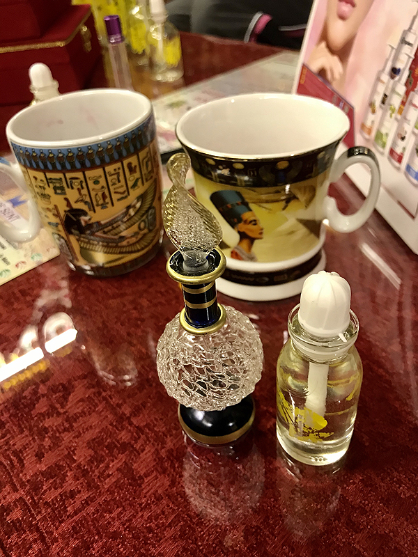 Tradiciškai šalia prieskonių, arbatų, aliejų buvo dar ir egiptietiškų aliejiniu pagrindu padarytų kvepaliukų. Štai čia pasikvėpinę trys Kleopatros ir vienas Tutanchamonas.