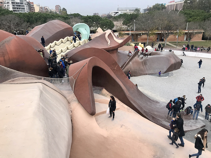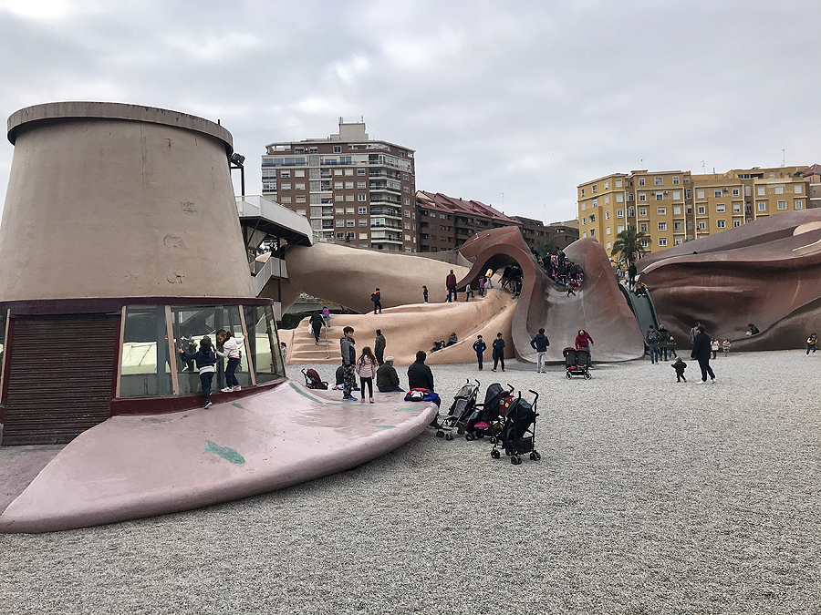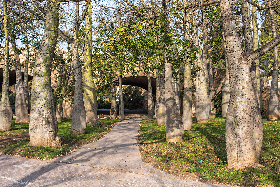 Ir štai kitą dieną jau su pilna komplektacija einame Turia upės dugnu. Taip taip, per visą Valensiją, gal apie 10km tekėjo upė Turia, bet ji buvo linkusi dažnai tvinti ir pridaryti rūpesčių, tad buvo nusausinta ir miestas turi ilgą platų parką. Turijos parke pilna įvairiausių užsiėmimų visiems - bėgikams skirti atskiri takeliai, kuriuose negalima važiuoti dviračiais ir eiti žmonėms, vaikams skirtos žaidimų aikštėlės, viena iš jų - vaikais, kaip skruzdėlytėm, aplipęs milžiniškas Guliveris, aptvertos teritorijos lakstyti šunims, o kur dar Bio parkas - ten gyvūnai vaikšto laisvėje, esantis miesto gale, ir mokslo ir menų miestelis, įsikūręs irgi ant upės dugno, ir įvairiausių įdomių augalų, medžių prisodinta, ir koncertų salė, ir ko tik ten nėra... Labaaaai patiko man ten vaikščioti, kai žiūrėjau į žemėlapį, galvojau, va, būtinai viską apeisiu. Deja, realybė pasirodė kitokia, nors didumą apėjome, dar liko nematytų vietų. Tiltai per ex upę įvairiausi, visi skirtingi, smalsu pažiūrėti iš apačios, o kas eina ar važiuoja mieste, netrukdo pramogaujantiems parke.