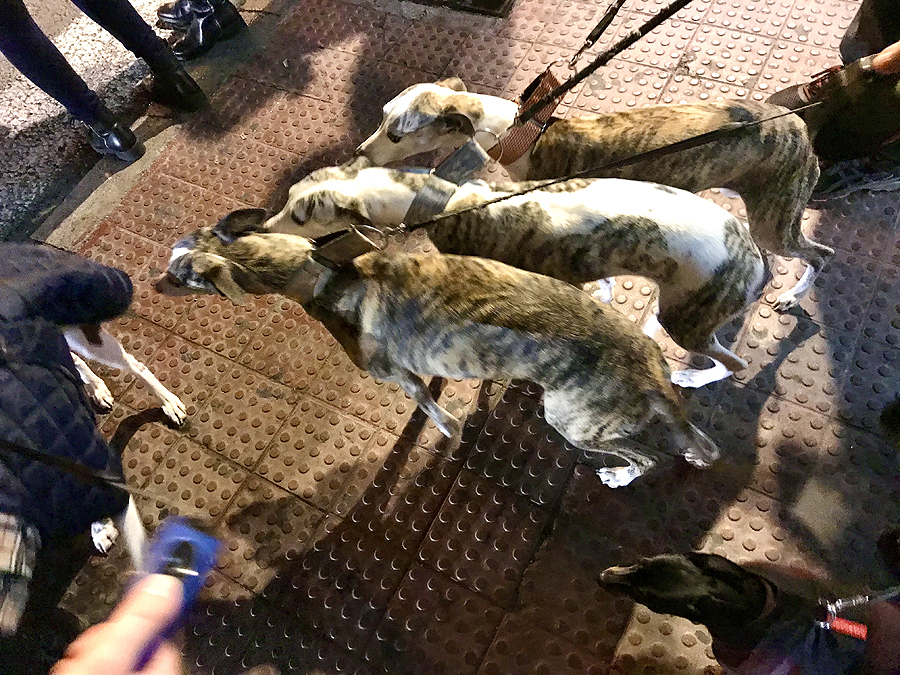 Kai malėmės po Valensiją, ieškodami kur pavalgyti, sutikome Ogio giminių. Trys vipetai! Ir visiems labai smalsu pažiūrėt į mūsų Ogį. Kokie jie fainučiai, visi vienodi :)