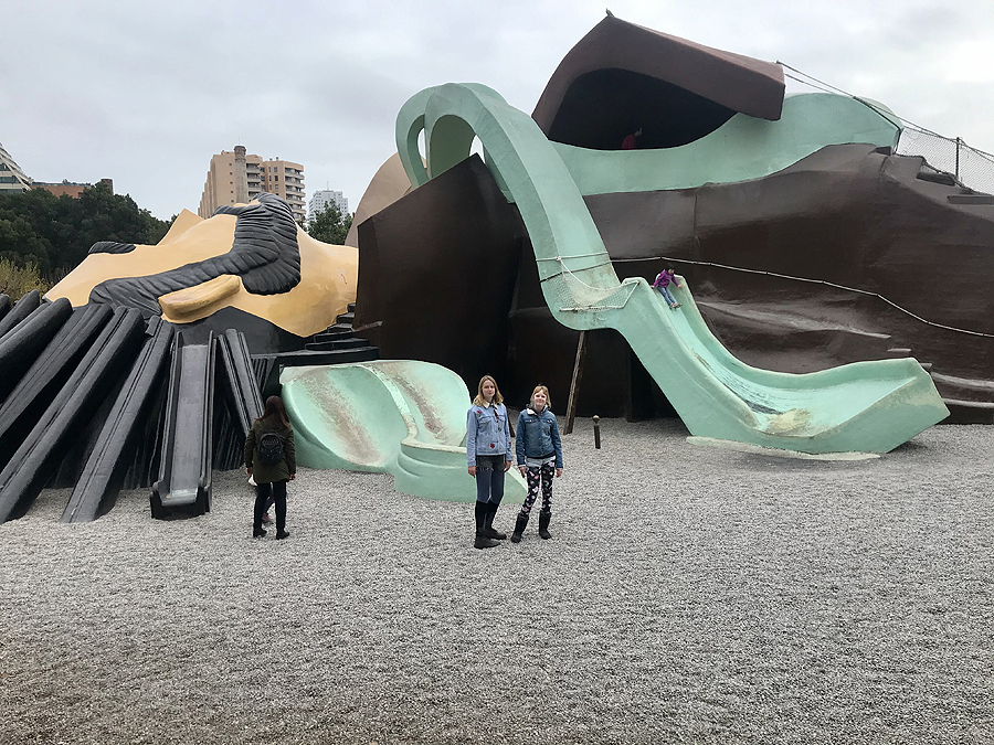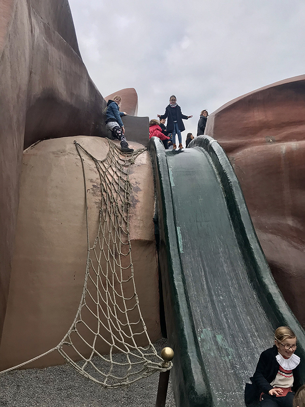 Leidžiam vaikus į Guliverio žaidimų aikštelę. Čia jo galva su plaukais-čiuožyklom matosi.