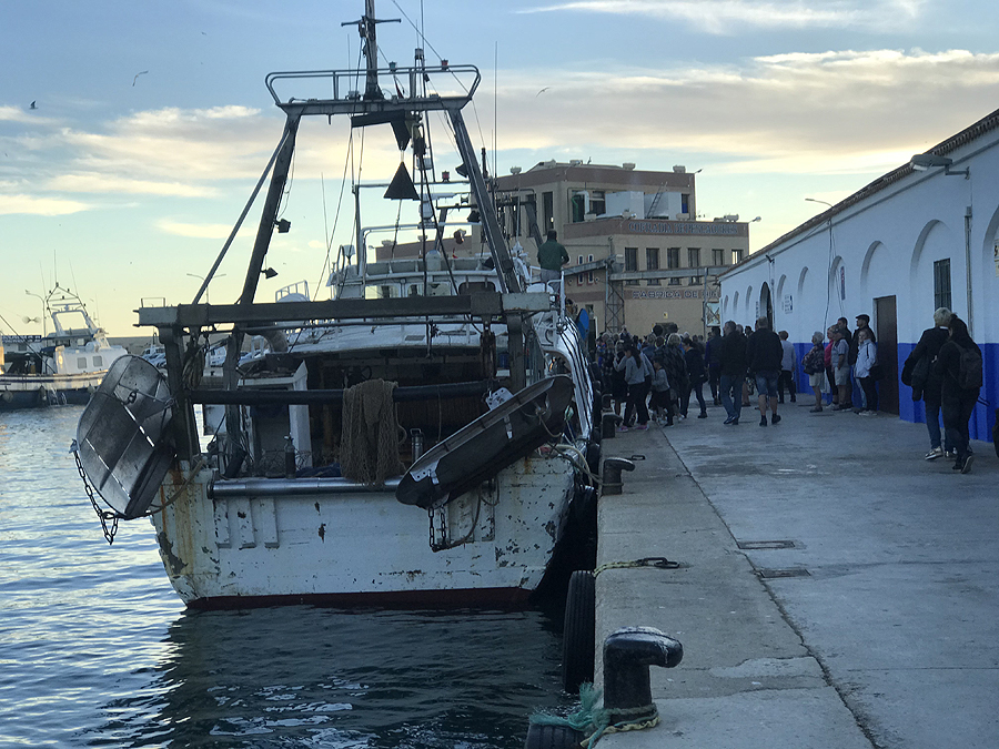 Ateinam prie turgelio - tai yra laivų prieplaukos. Matosi atpaukę laivai su žuvimis, pilna kiniečių, befotkinančių. Už eurą gali nueiti į halės vidų pažiūrėti, kaip žuvį superka restoranai ir barai - visas procesas ten, tad dauguma kiniečių ten ir suguža. Mes laukiame kas liks paprastiems mirtingiesiems, procesas užtrunka ir nueinam valgyti į šalia esantį barą, vis tikrindami ar jau parduoda žuvį vienetais, ne dėžėm.