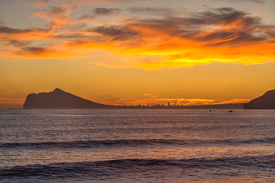 Saulėlydis fantastiškas! Tolumoje matosi "Ispanijos Niujorko" Benidormo dangoraižiai.
