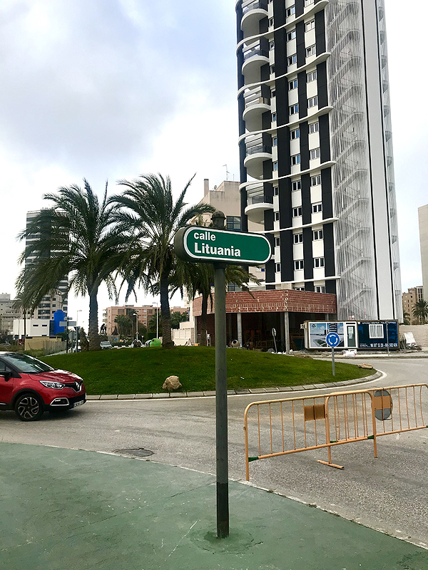 Antra diena, ryte atsibundu anksčiau už kitus ir išsėlinu ieškot flamingų ir pravedžiot šunio. Kūčių išvakarės, miestelis dar miega, promenadoje visi kalba vokiškai ir angliškai. Fotkinu gatvę, kurią užmatėm beieškodami savo vilos - Lietuvos gatvė, nu :) Šalia dar buvo ir Latvijos, ir visokių kitų, matyt, rajonas toks, su tema.