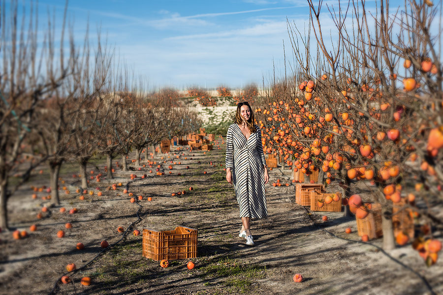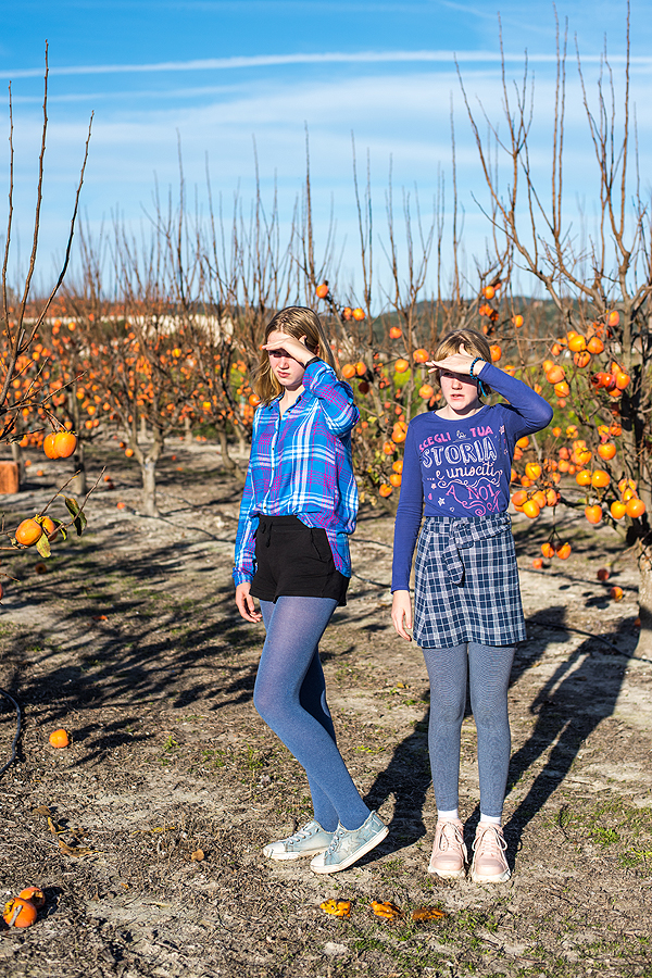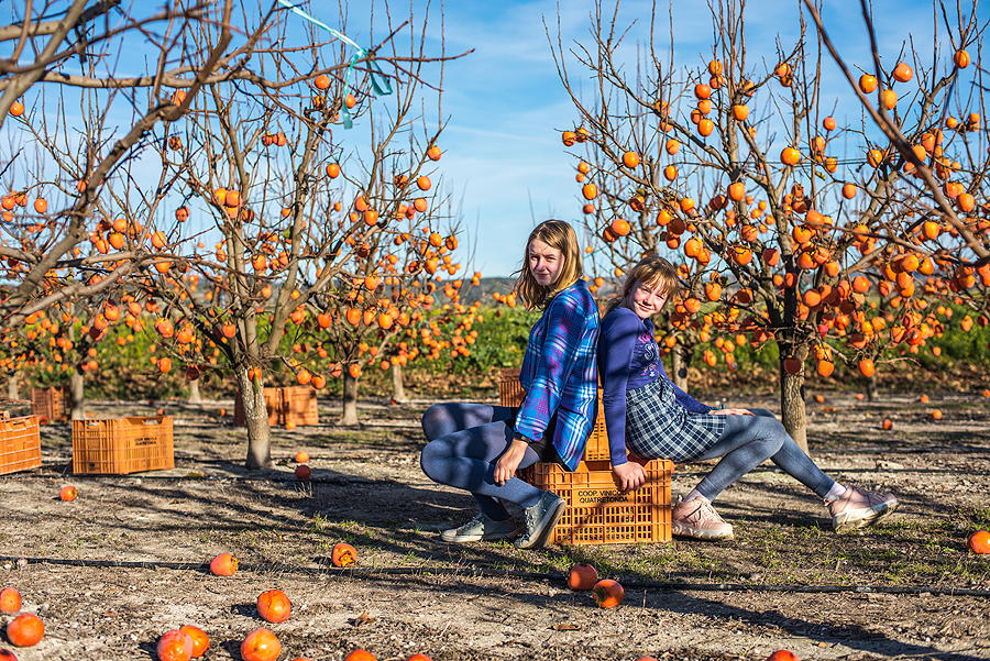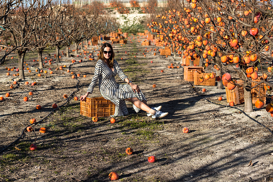 Važiuojant link mūsų vilos, užmatau nerealų lauką - jau ne pirmą kartą, augantys persimonai ir medeliai tik su vaisiais, bet be lapų! Prašau sustot - nerealiai fotogeniška! Stojam, vyras su šuniu laukuose vaikšto, šuo vaiko triušiukus - o jų ten galybė, tokių mažiukų, laukinių, vietiniai jų labai nemėgsta, mat derlių nuvalgo. Mūsiškis vipetas ir buvo spec. išveistas medžioti triušius, tad Ogiukui čia rojus. Kaip ir jo šeimininkei - tempiu vaikus į kitą plento pusę, į laukus, fotkintis.