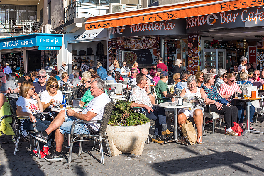 Pasivaikščiojimas pajūriu. Skaičiau, kad britų turistai jau čia nebenori - per daug žmonių jiems. O kažkada, apie 1950-uosius čia buvo ramus žvejų kaimelis... Kas lėmė tokias staigias permainas? Ogi, puiki geografinė padėtis - miestas apsuptas aukštų kalnų keterų, apsaugo nuo šaltų vėjų ir sulaiko šilumą, taip klimatas čia visus metus malonus, švelnus. Didelė britų įtaka, daug viešojo maitinimo taškų, naktinių klubų atidarytų būtent britų ir britams.