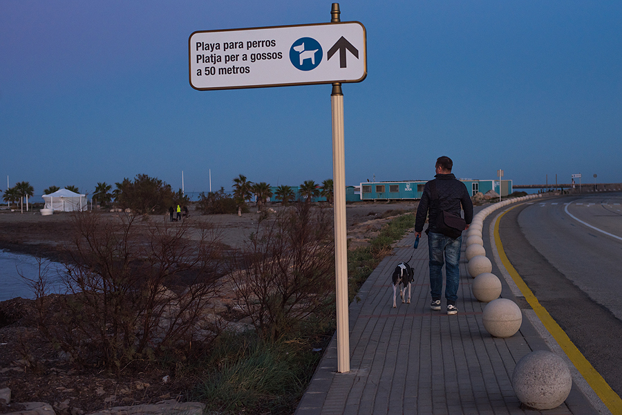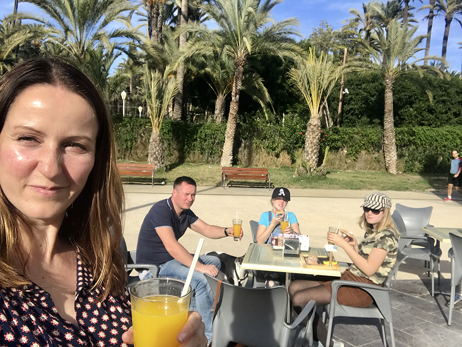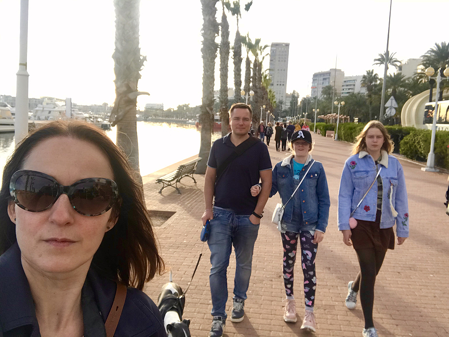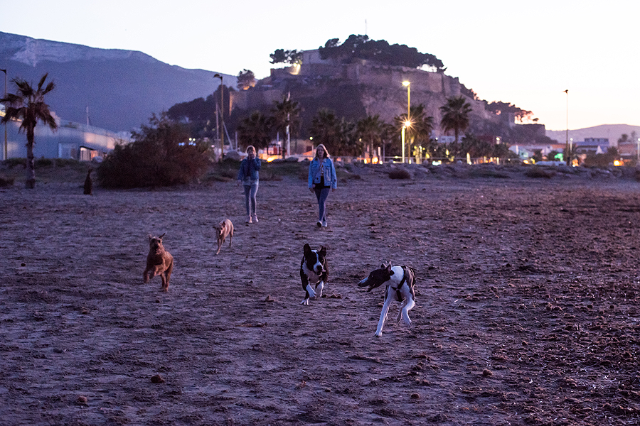 Nusileidžiame link jūros į Alikantę su tikslu pavalgyti, o ten vėjukas nemažas, tenka traukti šiltesnius drabužius. Yra Alikantės ir pilis, bet mums jau jų sočiai, anksčiau maniau, norėsiu pakilti, juo labiau yra ir liftas į kalną, vaizdai gražūs, bet vakaras vėsokas, atsimalę jaučiamės, tektų dalintis šuns priežiūra, nes į vidų su Ogiu negalima, tad tik sėdam bariuke šalia gražiosios Alikantės promenados ir džiaugiamės ramybe.