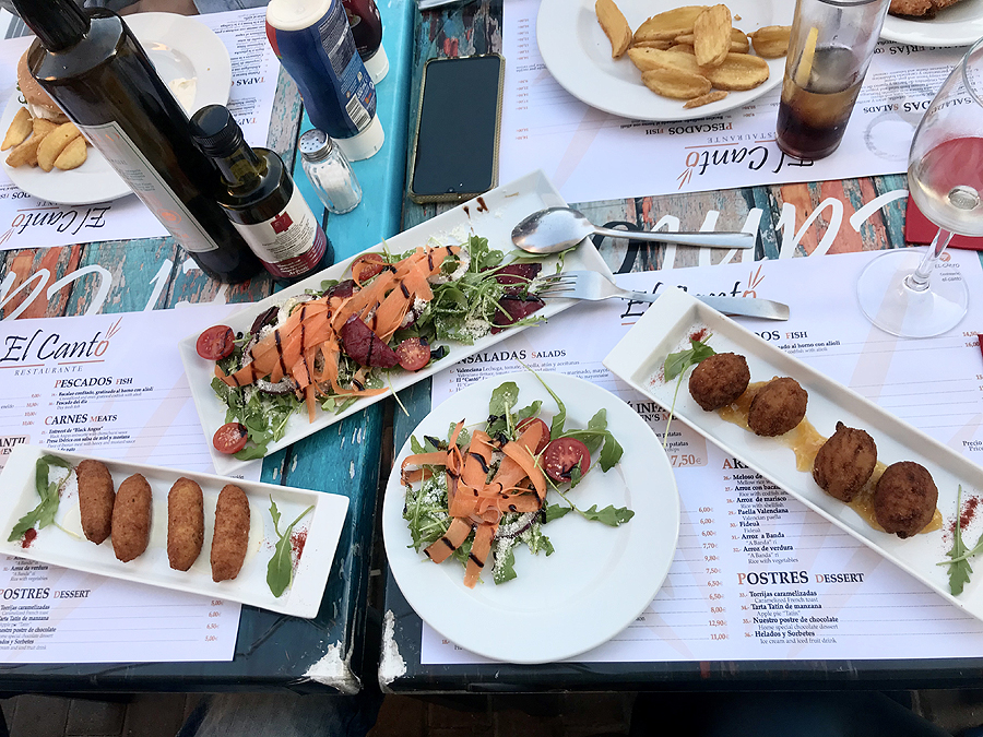 Tada žiūriu, kur čia valgyti - Denia, Gandia, Ksabija - pakeliui namo. Išsirenku Denia. Jaukus pajūrio miestelis, žinoma, vėl nosį riečia šlapimo tvaikas. Bet barų bariukų, tavernų, restoranėlių pilna! Renkamės gal ne patį fotogeniškiausią, bet taaaaip skaniai pamaitino!