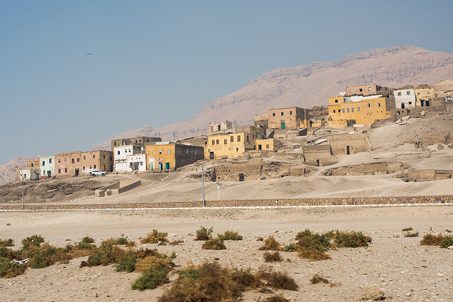Čia vakarinio miesto atradėjų namukai. Toliau kalnuose matosi juodos angos - senovės Tėbų laikotarpio kapavietės.