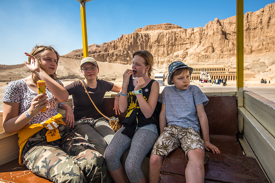 Ir atvykstame į Luxoro kitą krantą - miestas išsidėstęs abipus Nilo, tad vakarinėje Nilo pusėje yra mirusiųjų krantas - dėl to, kad čia leidžiasi saulė į "požemius", o rytinėje pusėje - gyvųjų krantas. Pradžioje važiuojame toliau - į vakarinę miesto pusę, į faraonės Hačepsutės šventyklą-kapą. Žiūrėjau foto internete, būčiau išvis išbraukusi šį tašką, tad nerealiai nervuojuos, kai gidas tupinėja aplink kiekvieną akmenį ir kol kas sąžiningai pasakoja apie viską dviem kalbom - rusų ir anglų.