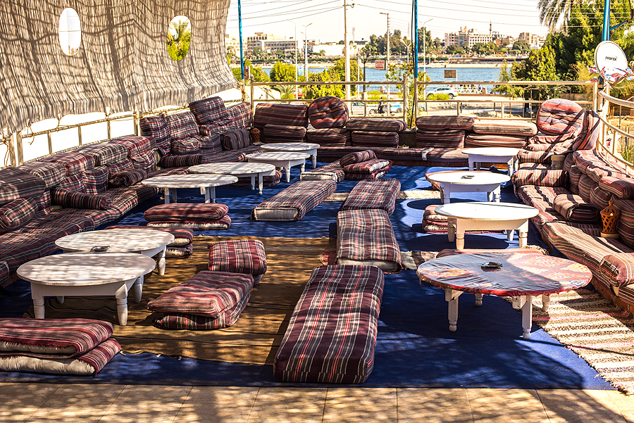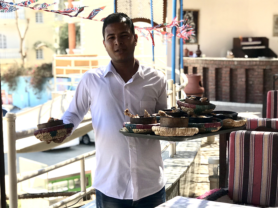 Ir tada pagaliau baigiasi mūsų priverstinis protarpinis badavimas, kaip juokavom. Einam į restoranėlį su vaizdu į Nilo upę ir pietaujam.