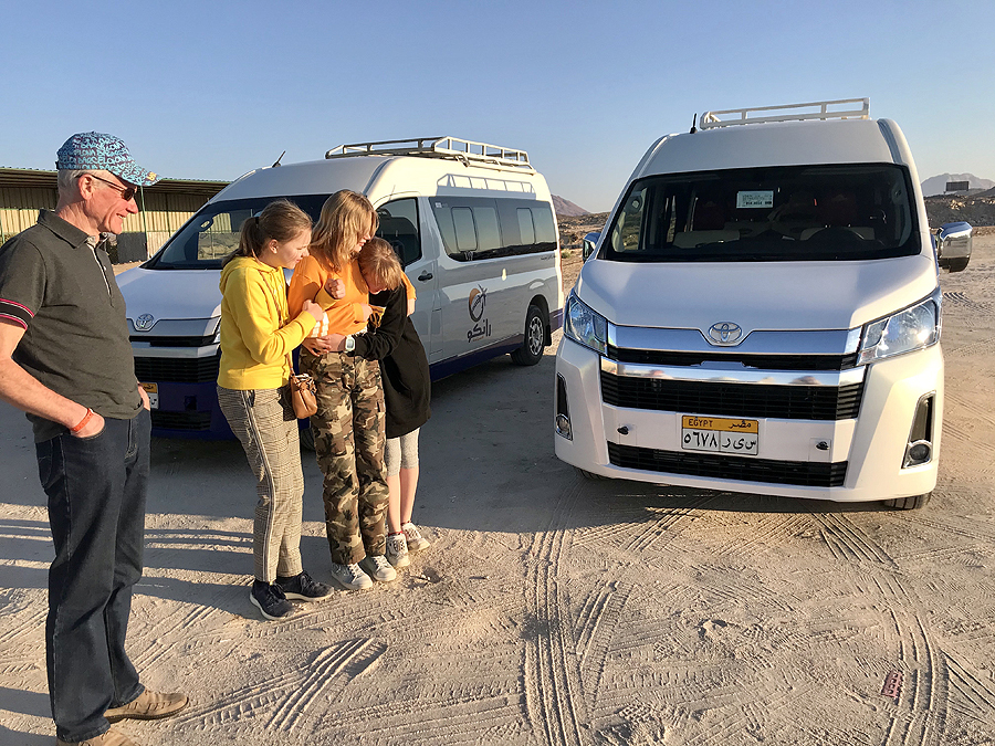 Keliamės 4 val, nes 4.45 jau turim būti pasiruošę. Susodina mus į autobusiuką mažiuką, du vairuotojai ir mūsų ekskursijos pardavėjas važiuoja - jam 4 dienos išeiginių, gyvena jis netoli Luxoro, tad naudojasi proga nuvykti į gimtinę. Kai prašvinta, matom, kad važiuojam per begalinę dykumą, smėlis, nedidukai kalniukai, šiukšlės...