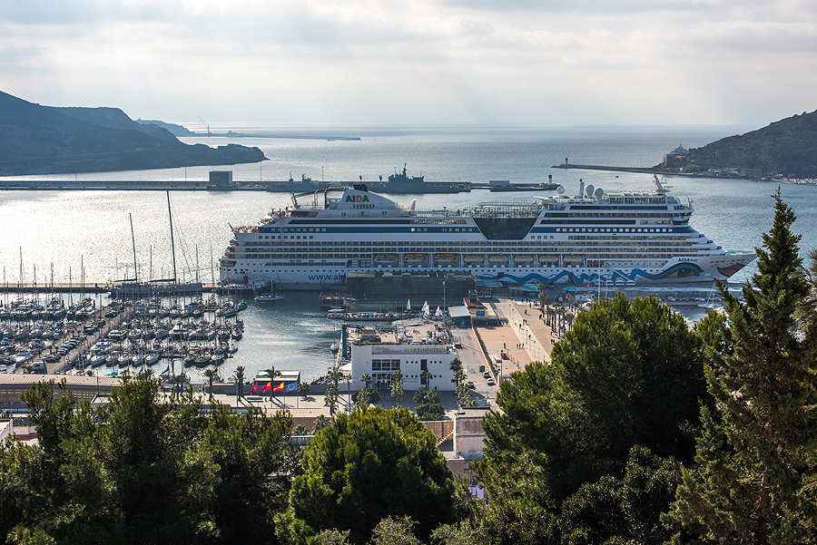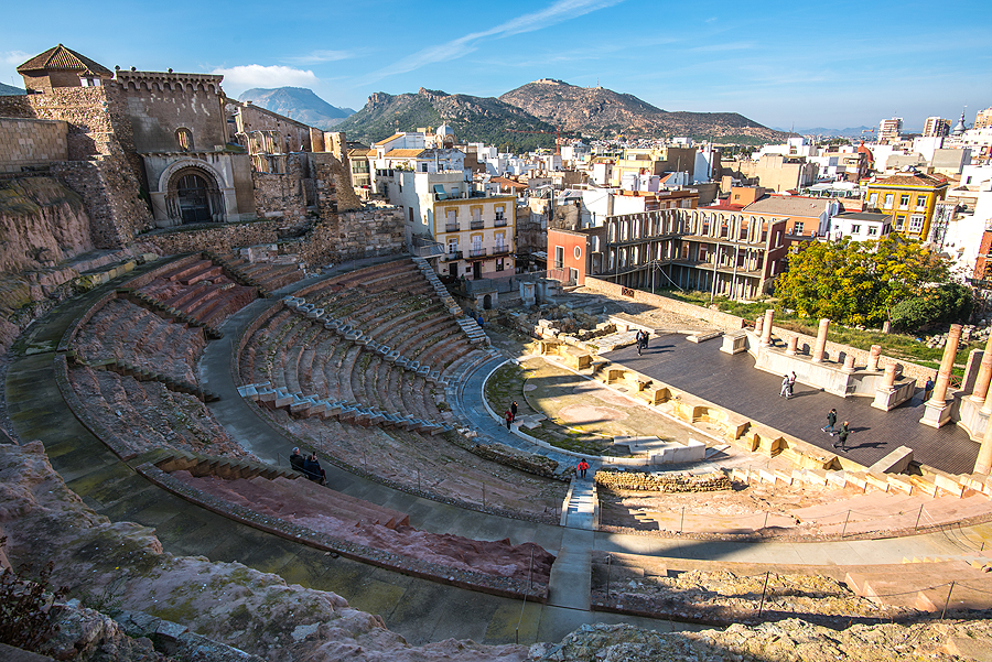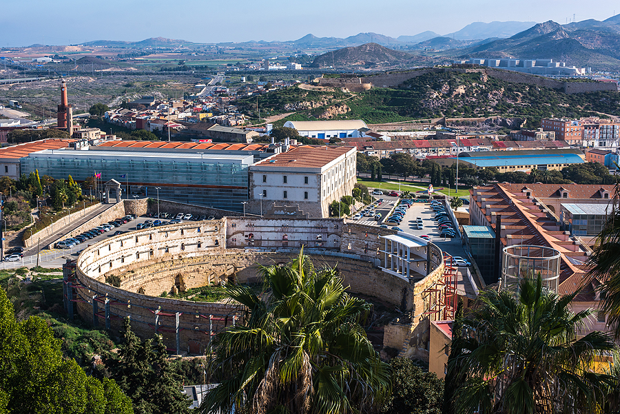 Cartagena apsupta kalvų, ant kurių matosi tvirtovės, pilys ir t.t.