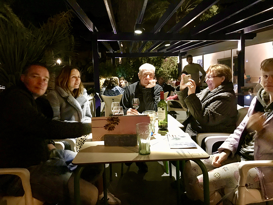 O mūsų šventinė vakarienė atrodo va taip - paskui ir valgytgavom, nesėdėjom prie butelio tik. Visi jau apsižiūrėję mūsų mažame pajūrio miestelyje, uošvis spėjo ir išsimaudyti, nusižiūri barą, bet jis, dieną buvęs labai "gyvas", dabar toks nebeatrodo, tad einame į mūsų namuko savininkų prancūzų užeigą, užsisakome krūvą tapos, vyno, ir vakarojame.