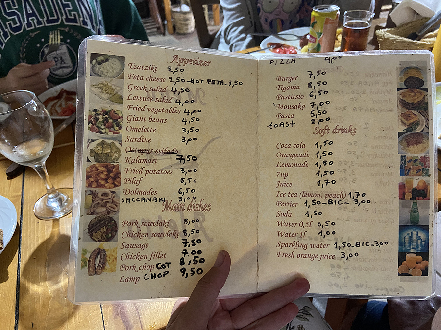 Užtat gaunu kokteiliuką iš vietinės tavernos savininko, sako, pas jį kažkada dirbo viena lietuvaitė. Baruos kainos žymiai aukštesnės, nei kitur, tad renkamės vakarienei vėl savo Pafkos miestelį, kur visokiausio plauko tavernų knibždėte knibžda.