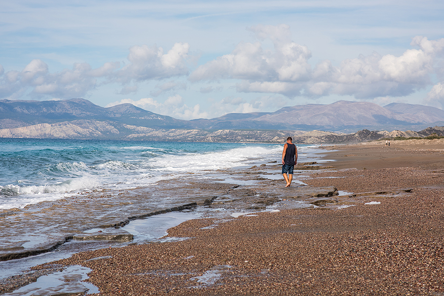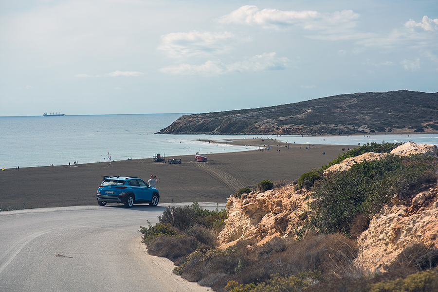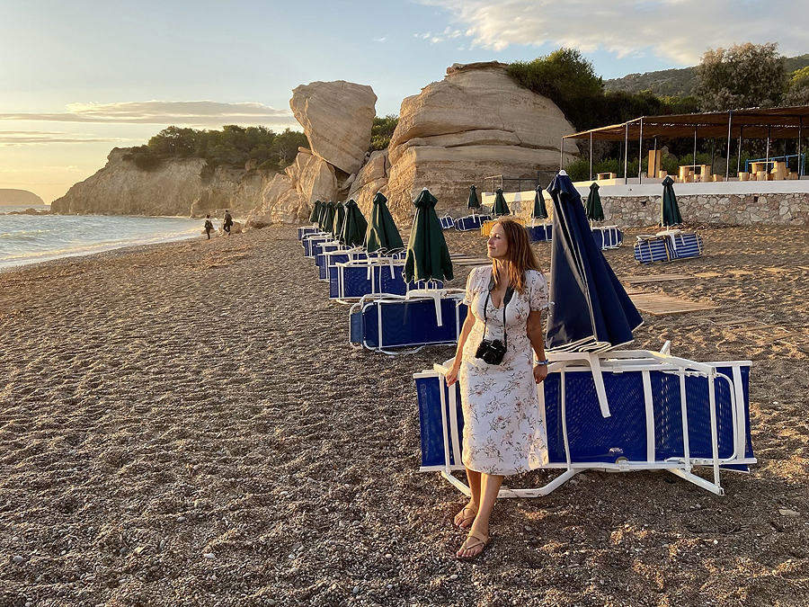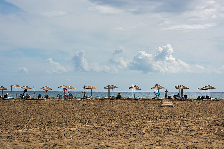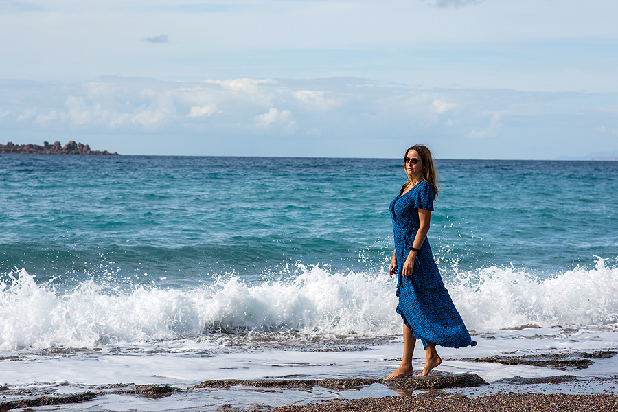 Tik privažiuojam kitą pakrantę, aš pradedu aikčiot - kokia vandens spalva! Ryški turkio! Stojam. Begalinio ilgio visiškai tuščias be pavadinimo, be jokio civilizacijos ženklo paplūdimys, nu ok, ilgis virš 10 km ir matėsi tolumoj pora nuogalių. Tik dvi tavernos išsidėstę palei šį ruožą.