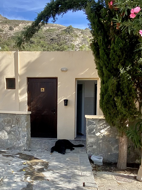 Prireikus tualeto, prie jo įėjimo randu tokį sargą... kiek nejauku. Bet sargas, pasirodo, labai draugiškas. Žinoma, ir kaip be kačių.